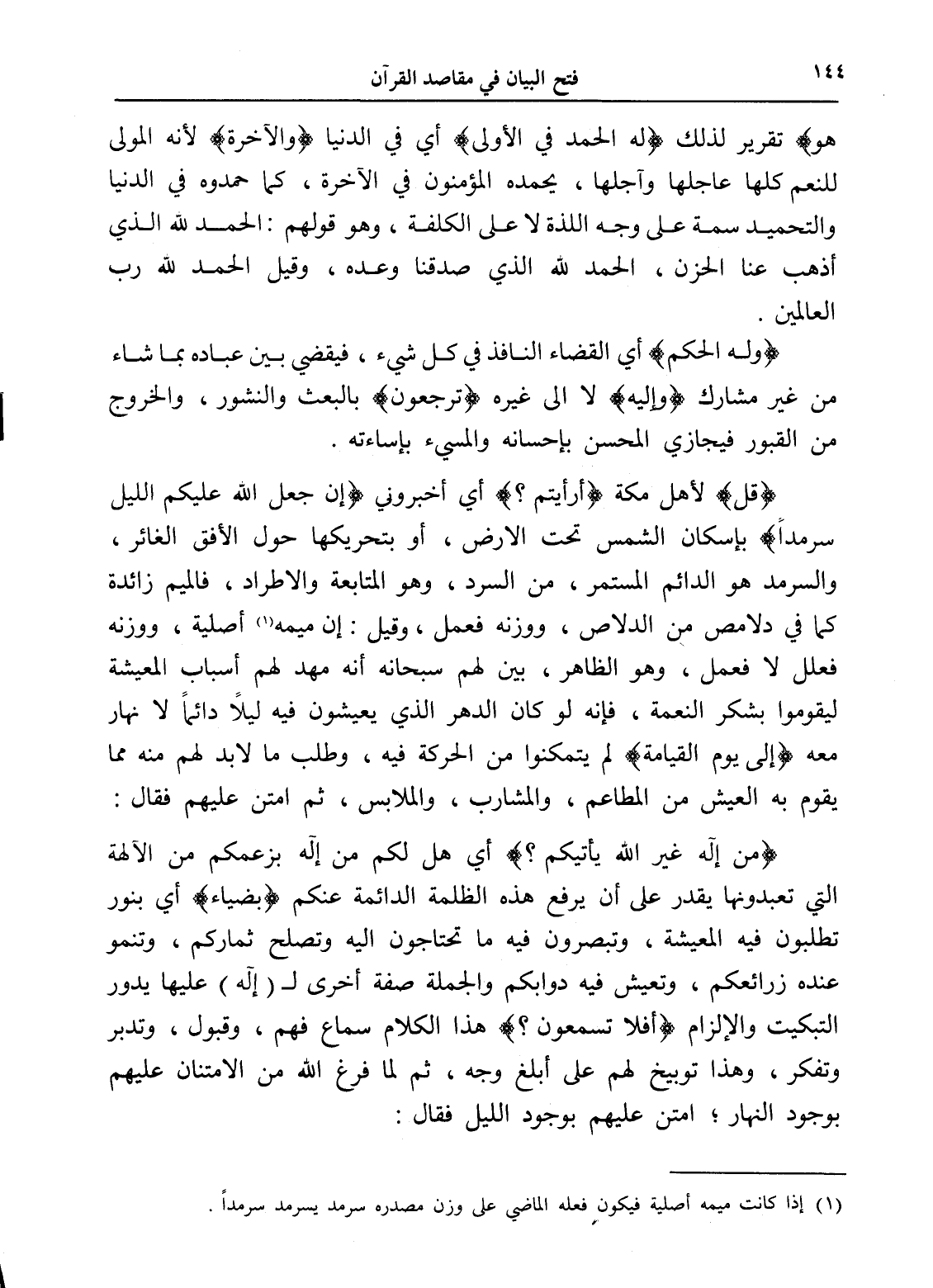 (قل) لأهل مكة (أرأيتم)؟ أي أخبروني (إن جعل الله عليكم الليل سرمداً بإسكان الشمس تحت الأرض، أو بتحريكها حول الأفق الغائر، والسرمد هو الدائم المستمر، من السرد، وهو المتابعة والاطراد، فالميم زائدة كما في دلامص من الدلاص، ووزنه فعمل، وقيل: إن ميمه (¬1) أصلية، ووزنه فعلل لا فعمل، وهو الظاهر، بين لهم سبحانه أنه مهد لهم أسباب المعيشة ليقوموا بشكر النعمة، فإنه لو كان الدهر الذي يعيشون فيه ليلاً دائماً لا نهار معه (إلى يوم القيامة) لم يتمكنوا من الحركة فيه، وطلب ما لا بد لهم منه مما يقوم به العيش من المطاعم، والمشارب، والملابس، ثم امتن عليهم فقال:
