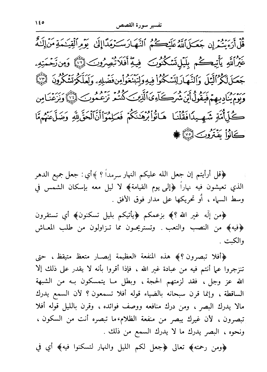 قُلْ أَرَأَيْتُمْ إِنْ جَعَلَ اللَّهُ عَلَيْكُمُ النَّهَارَ سَرْمَدًا إِلَى يَوْمِ الْقِيَامَةِ مَنْ إِلَهٌ غَيْرُ اللَّهِ يَأْتِيكُمْ بِلَيْلٍ تَسْكُنُونَ فِيهِ أَفَلَا تُبْصِرُونَ (72) وَمِنْ رَحْمَتِهِ جَعَلَ لَكُمُ اللَّيْلَ وَالنَّهَارَ لِتَسْكُنُوا فِيهِ وَلِتَبْتَغُوا مِنْ فَضْلِهِ وَلَعَلَّكُمْ تَشْكُرُونَ (73) وَيَوْمَ يُنَادِيهِمْ فَيَقُولُ أَيْنَ شُرَكَائِيَ الَّذِينَ كُنْتُمْ تَزْعُمُونَ (74) وَنَزَعْنَا مِنْ كُلِّ أُمَّةٍ شَهِيدًا فَقُلْنَا هَاتُوا بُرْهَانَكُمْ فَعَلِمُوا أَنَّ الْحَقَّ لِلَّهِ وَضَلَّ عَنْهُمْ مَا كَانُوا يَفْتَرُونَ (75)