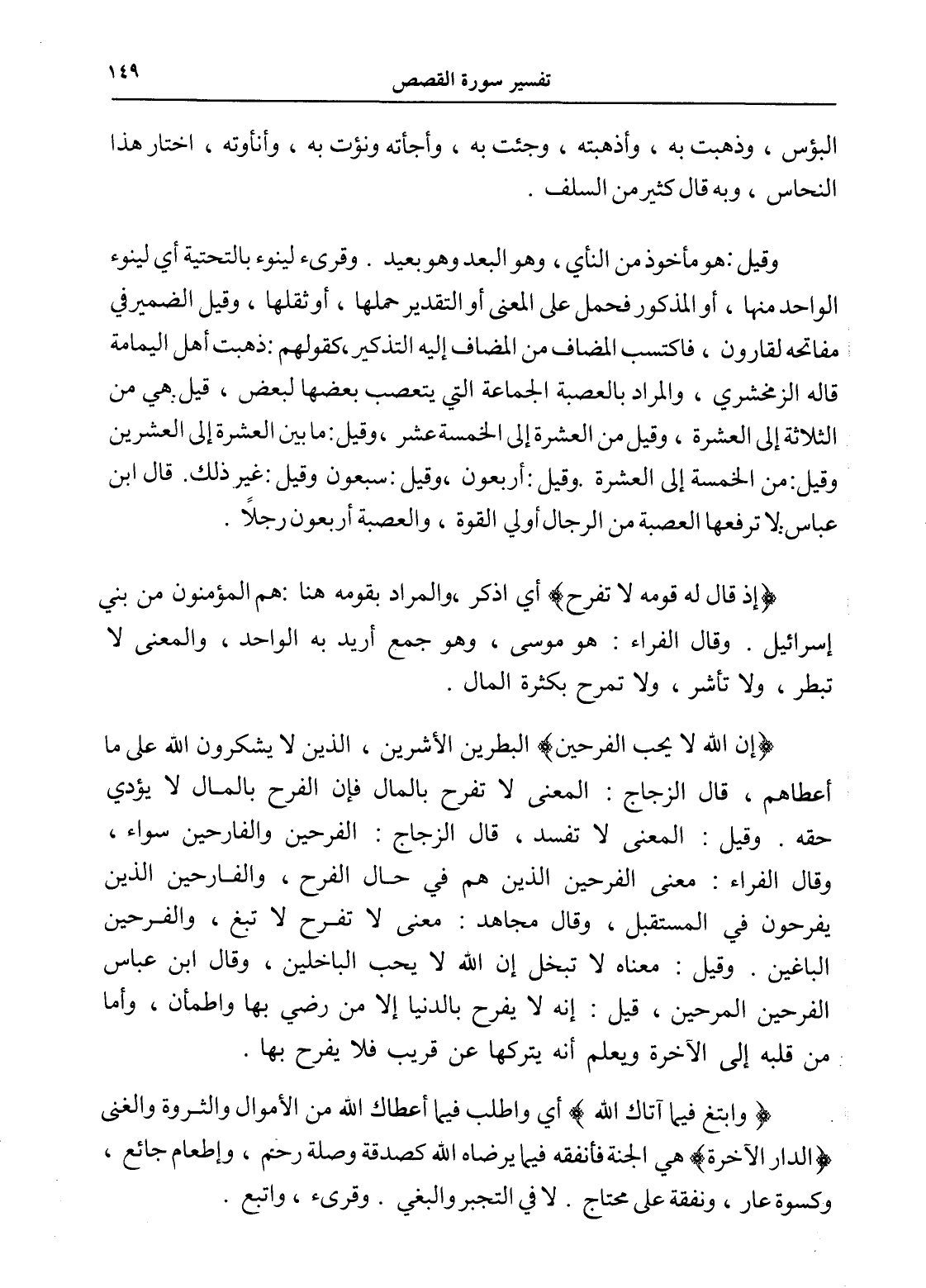 وقيل: هو مأخوذ من النأي، وهو البعد وهو بعيد. وقرئ لينوء بالتحتية أي لينوء الواحد منها، أو المذكور فحمل على المعنى أو التقدير حملها، أو ثقلها، وقيل الضمير في مفاتحه لقارون، فاكتسب المضاف من المضاف إليه التذكير، كقولهم: ذهبت أهل اليمامة قاله الزمخشري، والمراد بالعصبة الجماعة التي يتعصب بعضها لبعض، قيل: هي من الثلاثة إلى العشرة، وقيل من العشرة إلى الخمسة عشر، وقيل: ما بين العشرة إلى العشرين وقيل: من الخمسة إلى العشرة. وقيل: أربعون، وقيل: سبعون وقيل: غير ذلك. قال ابن عباس لا ترفعها العصبة من الرجال أولي القوة، والعصبة أربعون رجلاً.