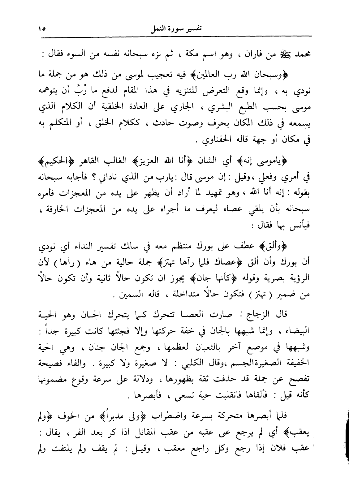 (وألق) عطف على بورك منتظم معه في سلك تفسير النداء أي نودي أن بورك وأن ألق (عصاك فلما رآها تهتز) جملة حالية من هاء (رآها) لأن الرؤية بصرية وقوله (كأنها جان) يجوز أن تكون حالاً ثانية وأن تكون حالاً من ضمير (تهتز) فتكون حالاً متداخلة، قاله السمين.