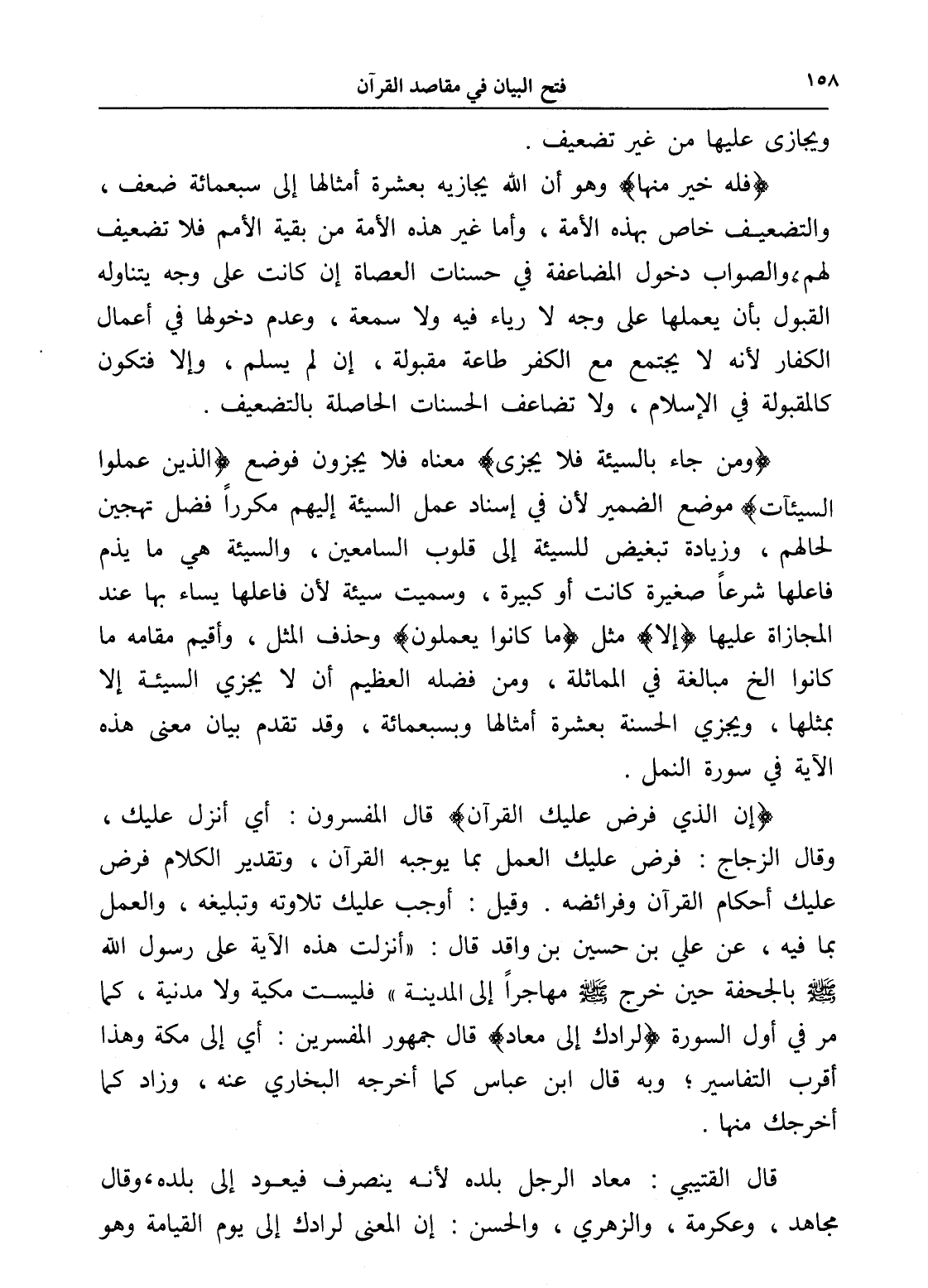 (إن الذي فرض عليك القرآن) قال المفسرون: أي أنزل عليك، وقال الزجاج: فرض عليك العمل بما يوجبه القرآن، وتقدير الكلام فرض عليك أحكام القرآن وفرائضه. وقيل: أوجب عليك تلاوته وتبليغه، والعمل بما فيه، عن علي بن حسين بن واقد قال: " أنزلت هذه الآية على رسول الله - صلى الله عليه وسلم - بالجحفة حين خرج - صلى الله عليه وسلم - مهاجراً إلى المدينة " فليست مكية ولا مدنية، كما مر في أول السورة (لرادك إلى معاد) قال جمهور المفسرين: أي إلى مكة وهذا أقرب التفاسير؛ وبه قال ابن عباس كما أخرجه البخاري عنه، وزاد كما أخرجك منها.
