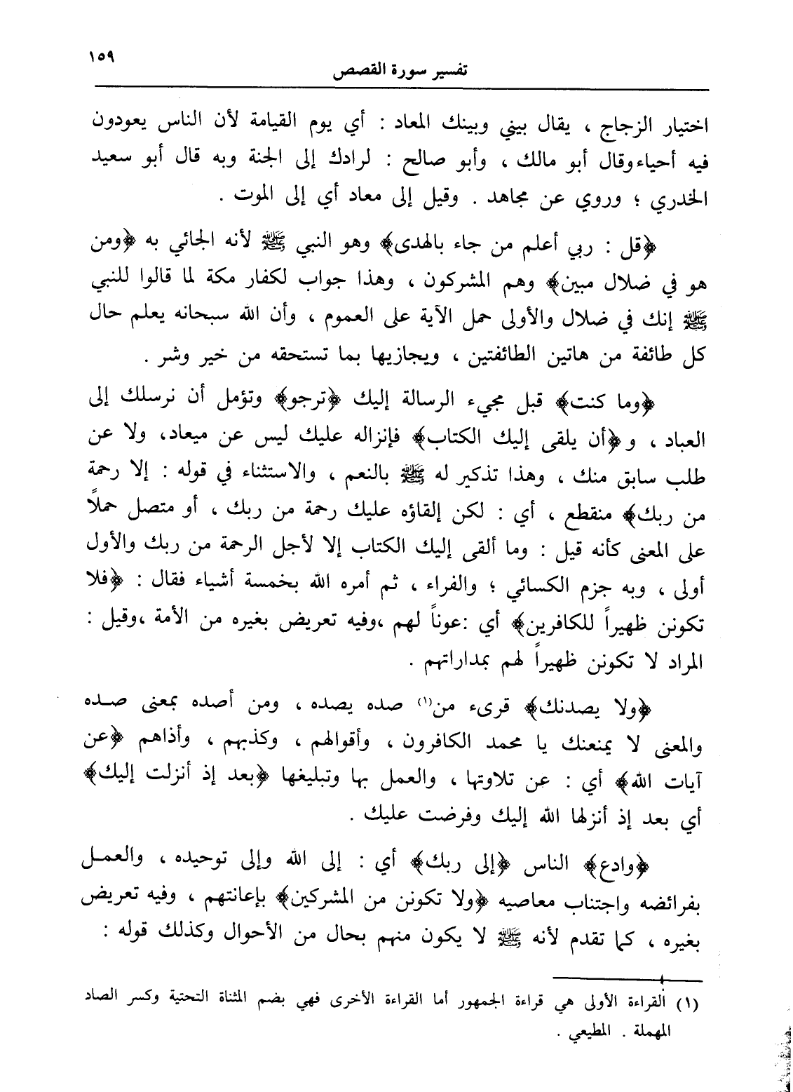 (¬1) القراءة الأولى هي قراءة الجمهور أما القراءة الأخرى فهي بضم المثناة التحتية وكسر الصاد المهملة. المطيعي.