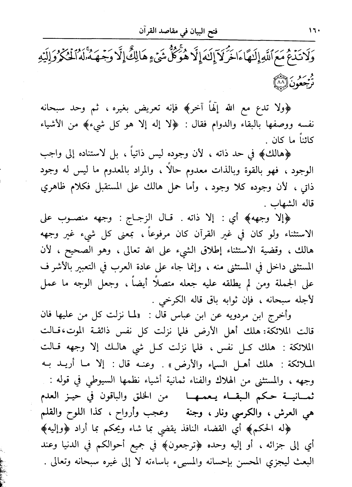 وَلَا تَدْعُ مَعَ اللَّهِ إِلَهًا آخَرَ لَا إِلَهَ إِلَّا هُوَ كُلُّ شَيْءٍ هَالِكٌ إِلَّا وَجْهَهُ لَهُ الْحُكْمُ وَإِلَيْهِ تُرْجَعُونَ (88)