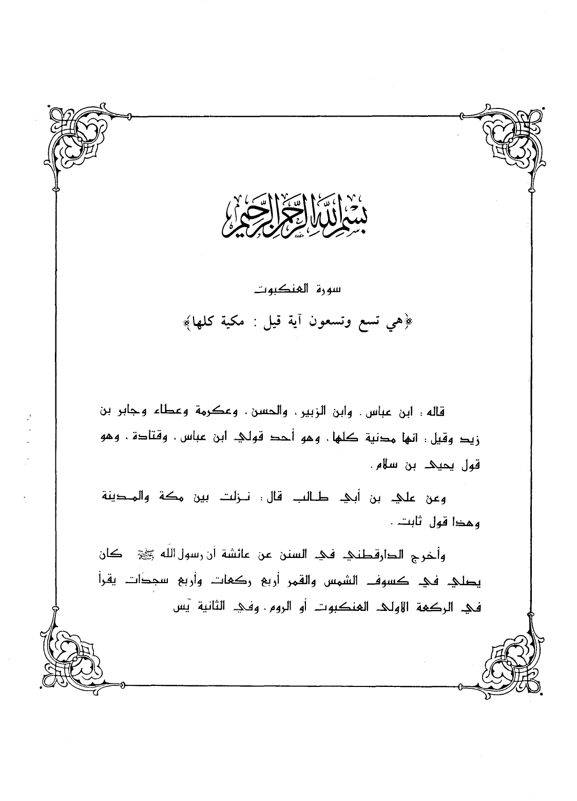 وأخرج الدارقطني في السنن عن عائشة أن رسول الله - صلى الله عليه وسلم - كان يصلي في كسوف الشمس والقمر أربع ركعات وأربع سجدات يقرأ في الركعة الأولى العنكبوت أو الروم، وفي الثانية يس.