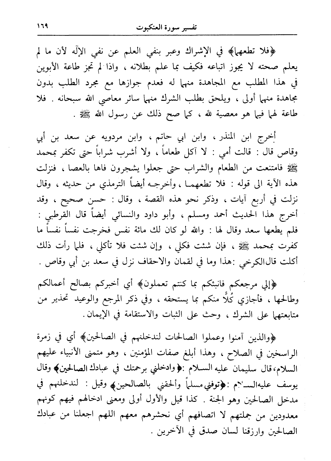 أخرج ابن المنذر، وابن أبي حاتم، وابن مردويه عن سعد بن أبي وقاص قال: قالت أمي: لا آكل طعاماً، ولا أشرب شراباً حتى تكفر بمحمد - صلى الله عليه وسلم - فامتنعت من الطعام والشراب حتى جعلوا يشجرون فاها بالعصا، فنزلت هذه الآية إلى قوله: فلا تطعهما، وأخرجه أيضاً الترمذي من حديثه، وقال نزلت في أربع آيات، وذكر نحو هذه القصة، وقال: حسن صحيح، وقد أخرج هذا الحديث أحمد ومسلم، وأبو داود والنسائي أيضاً قال القرطبي: فلم يطعها سعد وقال لها: والله لو كان لك مائة نفس فخرجت نفساً نفساً ما كفرت بمحمد - صلى الله عليه وسلم -، فإن شئت فكلي، وإن شئت فلا تأكلي، فلما رأت ذلك أكلت قال الكرخي: هذا وما في لقمان والأحقاف نزل في سعد بن أبي وقاص.