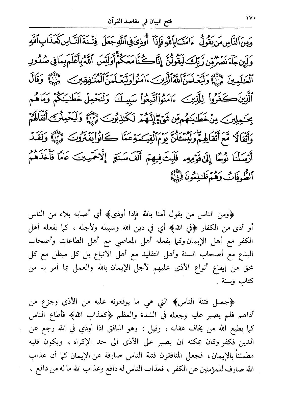 وَمِنَ النَّاسِ مَنْ يَقُولُ آمَنَّا بِاللَّهِ فَإِذَا أُوذِيَ فِي اللَّهِ جَعَلَ فِتْنَةَ النَّاسِ كَعَذَابِ اللَّهِ وَلَئِنْ جَاءَ نَصْرٌ مِنْ رَبِّكَ لَيَقُولُنَّ إِنَّا كُنَّا مَعَكُمْ أَوَلَيْسَ اللَّهُ بِأَعْلَمَ بِمَا فِي صُدُورِ الْعَالَمِينَ (10) وَلَيَعْلَمَنَّ اللَّهُ الَّذِينَ آمَنُوا وَلَيَعْلَمَنَّ الْمُنَافِقِينَ (11) وَقَالَ الَّذِينَ كَفَرُوا لِلَّذِينَ آمَنُوا اتَّبِعُوا سَبِيلَنَا وَلْنَحْمِلْ خَطَايَاكُمْ وَمَا هُمْ بِحَامِلِينَ مِنْ خَطَايَاهُمْ مِنْ شَيْءٍ إِنَّهُمْ لَكَاذِبُونَ (12) وَلَيَحْمِلُنَّ أَثْقَالَهُمْ وَأَثْقَالًا مَعَ أَثْقَالِهِمْ وَلَيُسْأَلُنَّ يَوْمَ الْقِيَامَةِ عَمَّا كَانُوا يَفْتَرُونَ (13) وَلَقَدْ أَرْسَلْنَا نُوحًا إِلَى قَوْمِهِ فَلَبِثَ فِيهِمْ أَلْفَ سَنَةٍ إِلَّا خَمْسِينَ عَامًا فَأَخَذَهُمُ الطُّوفَانُ وَهُمْ ظَالِمُونَ (14)