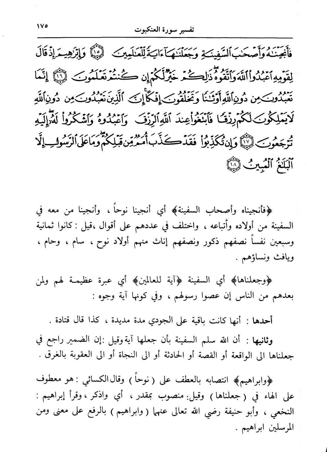 فَأَنْجَيْنَاهُ وَأَصْحَابَ السَّفِينَةِ وَجَعَلْنَاهَا آيَةً لِلْعَالَمِينَ (15) وَإِبْرَاهِيمَ إِذْ قَالَ لِقَوْمِهِ اعْبُدُوا اللَّهَ وَاتَّقُوهُ ذَلِكُمْ خَيْرٌ لَكُمْ إِنْ كُنْتُمْ تَعْلَمُونَ (16) إِنَّمَا تَعْبُدُونَ مِنْ دُونِ اللَّهِ أَوْثَانًا وَتَخْلُقُونَ إِفْكًا إِنَّ الَّذِينَ تَعْبُدُونَ مِنْ دُونِ اللَّهِ لَا يَمْلِكُونَ لَكُمْ رِزْقًا فَابْتَغُوا عِنْدَ اللَّهِ الرِّزْقَ وَاعْبُدُوهُ وَاشْكُرُوا لَهُ إِلَيْهِ تُرْجَعُونَ (17) وَإِنْ تُكَذِّبُوا فَقَدْ كَذَّبَ أُمَمٌ مِنْ قَبْلِكُمْ وَمَا عَلَى الرَّسُولِ إِلَّا الْبَلَاغُ الْمُبِينُ (18)