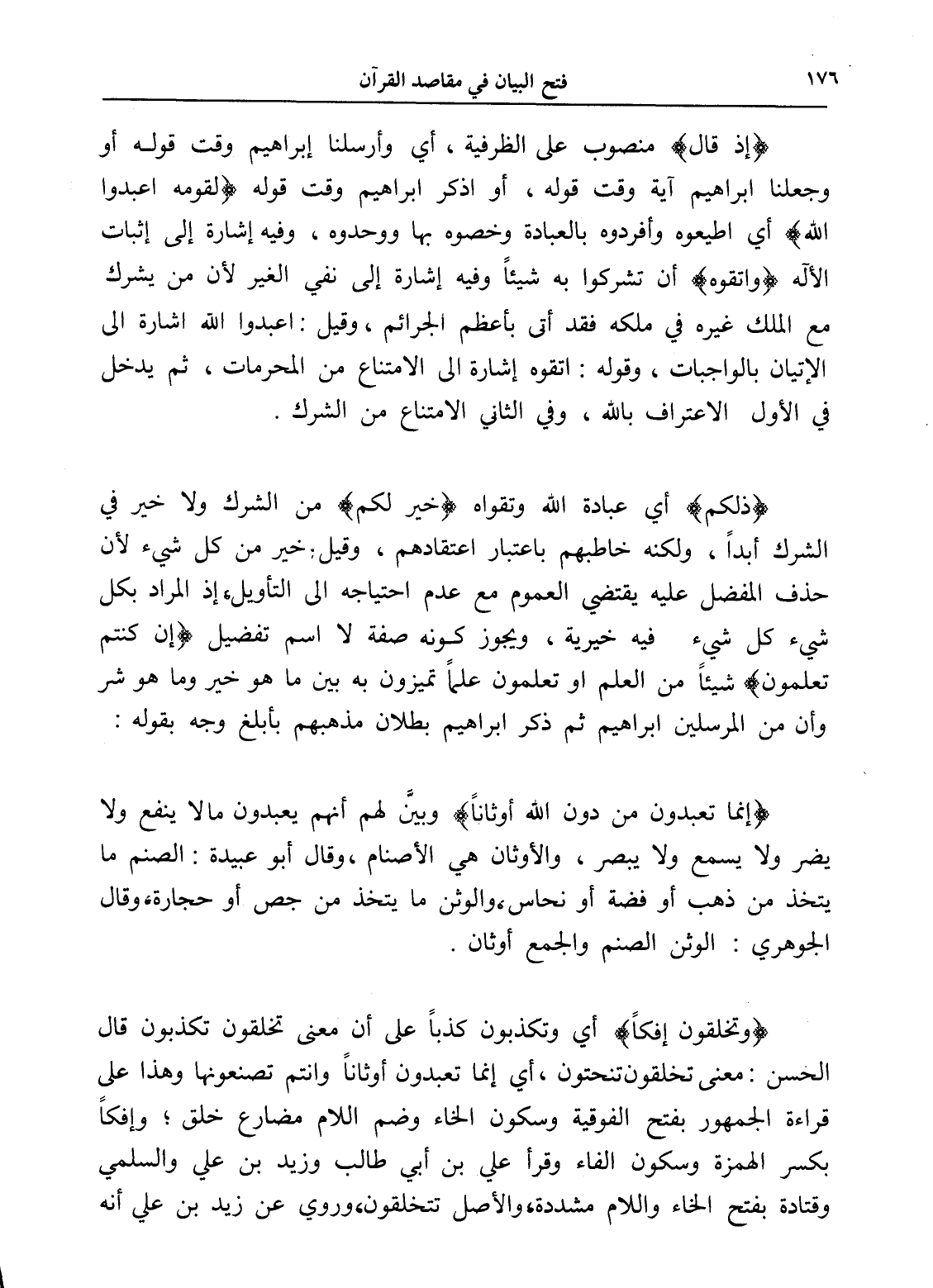 (إنما تعبدون من دون الله أوثاناً) وبيَّن لهم أنهم يعبدون ما لا ينفع ولا يضر ولا يسمع ولا يبصر، والأوثان هي الأصنام، وقال أبو عبيدة: الصنم ما يتخذ من ذهب أو فضة أو نحاس: والوثن ما يتخذ من جص أو حجارة، وقال الجوهري: الوثن الصنم والجمع أوثان.