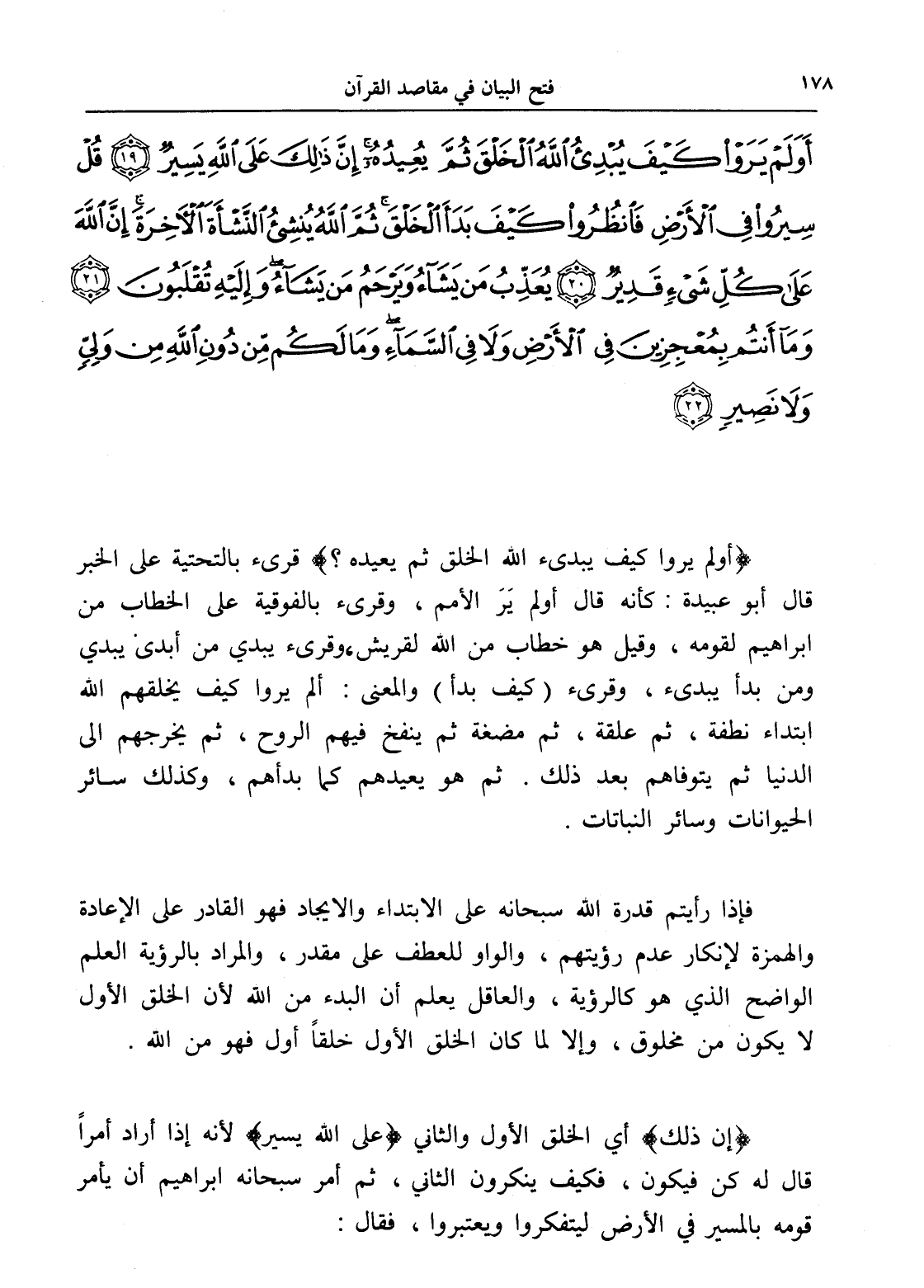 أَوَلَمْ يَرَوْا كَيْفَ يُبْدِئُ اللَّهُ الْخَلْقَ ثُمَّ يُعِيدُهُ إِنَّ ذَلِكَ عَلَى اللَّهِ يَسِيرٌ (19) قُلْ سِيرُوا فِي الْأَرْضِ فَانْظُرُوا كَيْفَ بَدَأَ الْخَلْقَ ثُمَّ اللَّهُ يُنْشِئُ النَّشْأَةَ الْآخِرَةَ إِنَّ اللَّهَ عَلَى كُلِّ شَيْءٍ قَدِيرٌ (20) يُعَذِّبُ مَنْ يَشَاءُ وَيَرْحَمُ مَنْ يَشَاءُ وَإِلَيْهِ تُقْلَبُونَ (21) وَمَا أَنْتُمْ بِمُعْجِزِينَ فِي الْأَرْضِ وَلَا فِي السَّمَاءِ وَمَا لَكُمْ مِنْ دُونِ اللَّهِ مِنْ وَلِيٍّ وَلَا نَصِيرٍ (22)