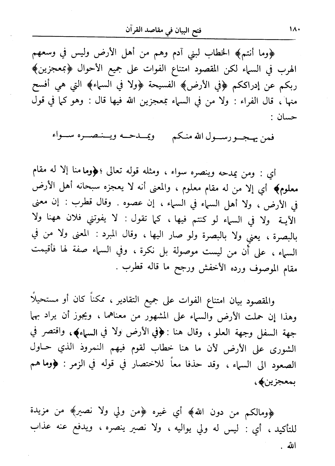 (وما أنتم) الخطاب لبني آدم وهم من أهل الأرض وليس في وسعهم الهرب في السماء لكن المقصود امتناع الفوات على جميع الأحوال (بمعجزين) ربكم عن إدراككم (في الأرض) الفسيحة (ولا في السماء) التي هي أفسح منها، قال الفراء: ولا من في السماء بمعجزين الله فيها قال: وهو كما في قول حسان: