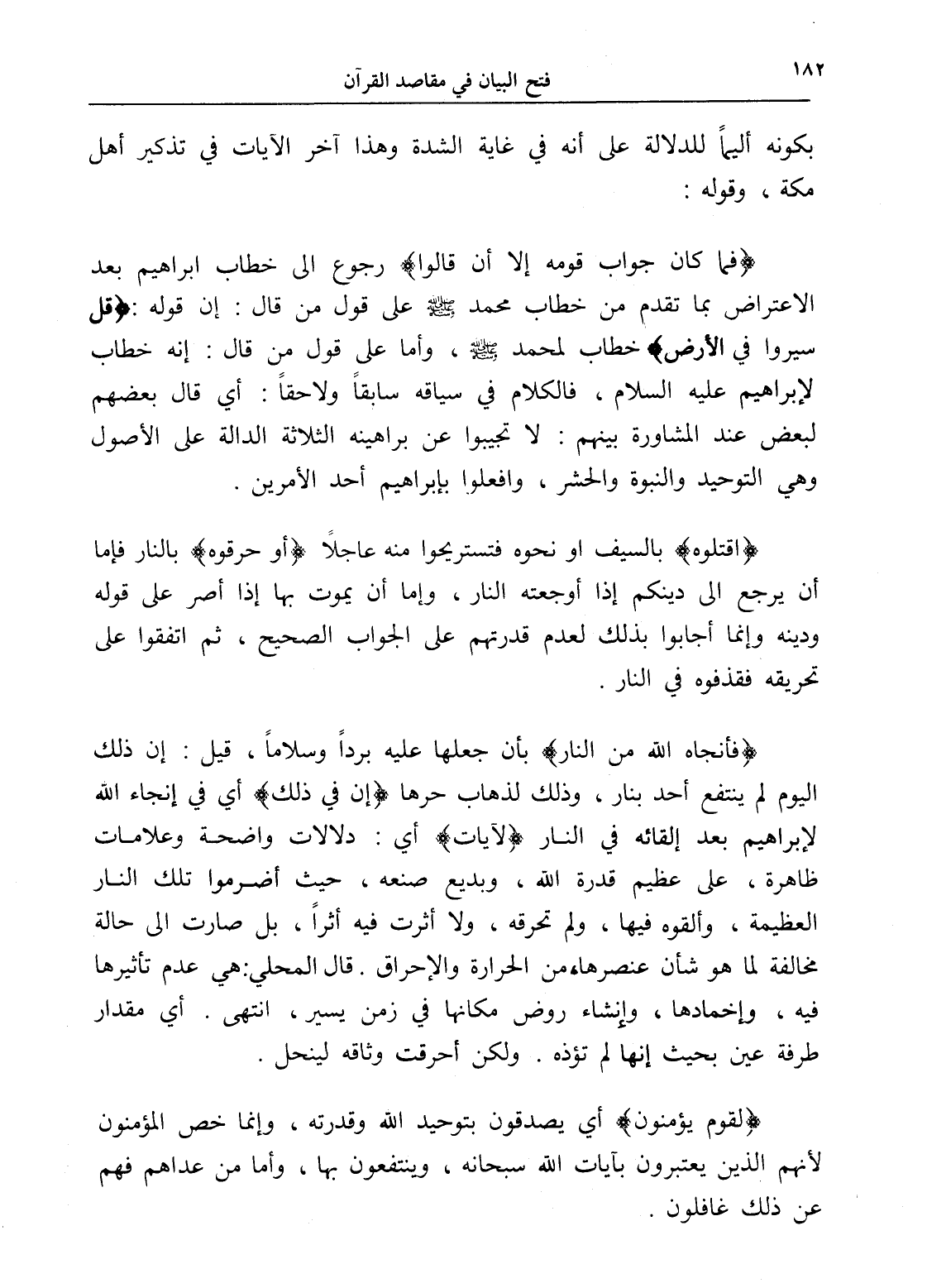 (فأنجاه الله من النار) بأن جعلها عليه برداً وسلاماً، قيل: إن ذلك اليوم لم ينتفع أحد بنار، وذلك لذهاب حرها (إن في ذلك) أي في إنجاء الله لإبراهيم بعد إلقائه في النار (لآيات) أي: دلالات واضحة وعلامات ظاهرة، على عظيم قدرة الله، وبديع صنعه، حيث أضرموا تلك النار العظيمة، وألقوه فيها، ولم تحرقه، ولا أثرت فيه أثراً، بل صارت إلى حالة مخالفة لما هو شأن عنصرها، من الحرارة والإحراق. قال المحلي: هي عدم تأثيرها فيه، وإخمادها، وإنشاء روض مكانها في زمن يسير، انتهى. أي مقدار طرفة عين بحيث إنها لم تؤذه. ولكن أحرقت وثاقه لينحل.