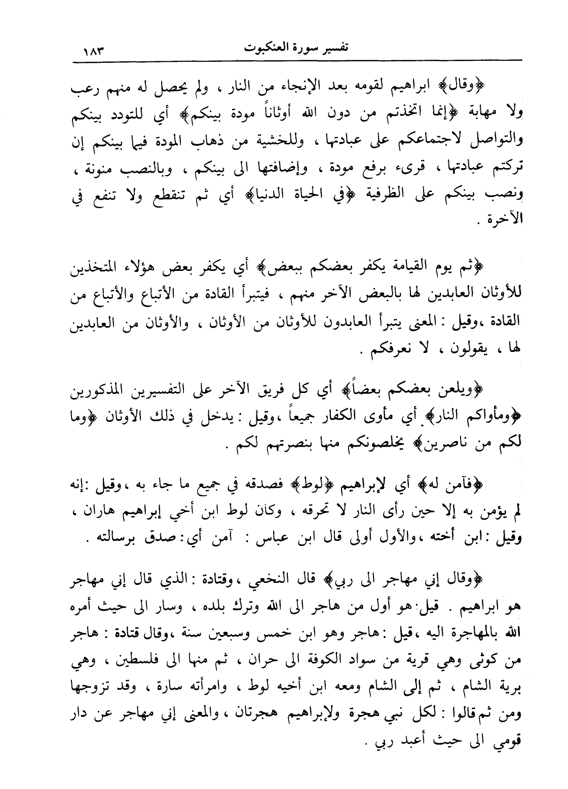 (وقال) إبراهيم لقومه بعد الإنجاء من النار، ولم يحصل له منهم رعب ولا مهابة (إنما اتخذتم من دون الله أوثاناً مودة بينكم) أي للتودد بينكم والتواصل لاجتماعكم على عبادتها، وللخشية من ذهاب المودة فيما بينكم إن تركتم عبادتها، قرئ برفع مودة، وإضافتها إلى بينكم، وبالنصب منونة، ونصب بينكم على الظرفية (في الحياة الدنيا) أي ثم تنقطع ولا تنفع في الآخرة.