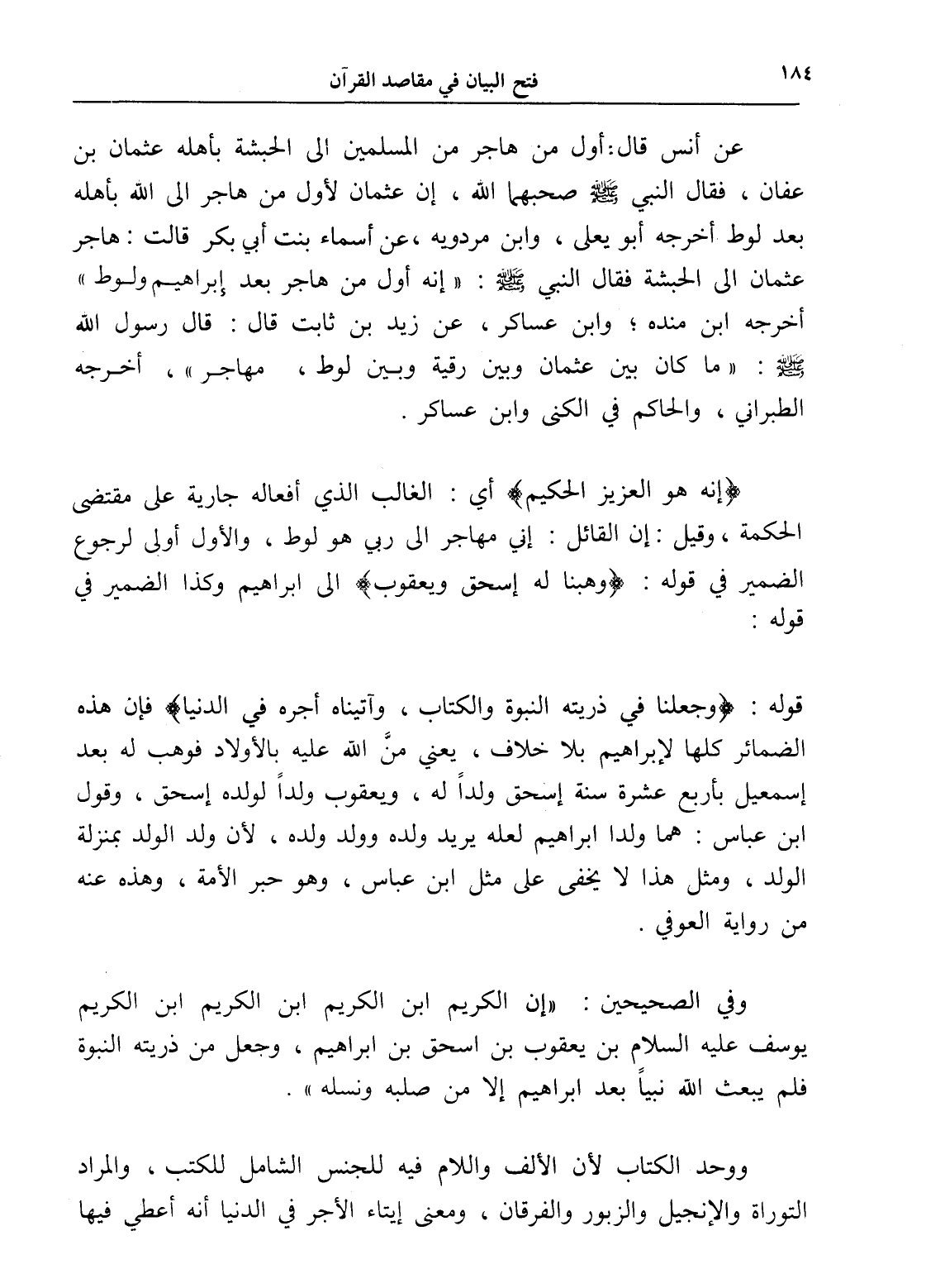 قوله: (وجعلنا في ذريته النبوة والكتاب، وآتيناه أجره في الدنيا) فإن هذه الضمائر كلها لإبراهيم بلا خلاف، يعني منَّ الله عليه بالأولاد فوهب له بعد إسماعيل بأربع عشرة سنة إسحاق ولداً له، ويعقوب ولداً لولده إسحق، وقول ابن عباس: هما ولدا إبراهيم لعله يريد ولده وولد ولده، لأن ولد الولد بمنزلة الولد، ومثل هذا لا يخفى على مثل ابن عباس، وهو حبر الأمة، وهذه عنه من رواية العوفي.
