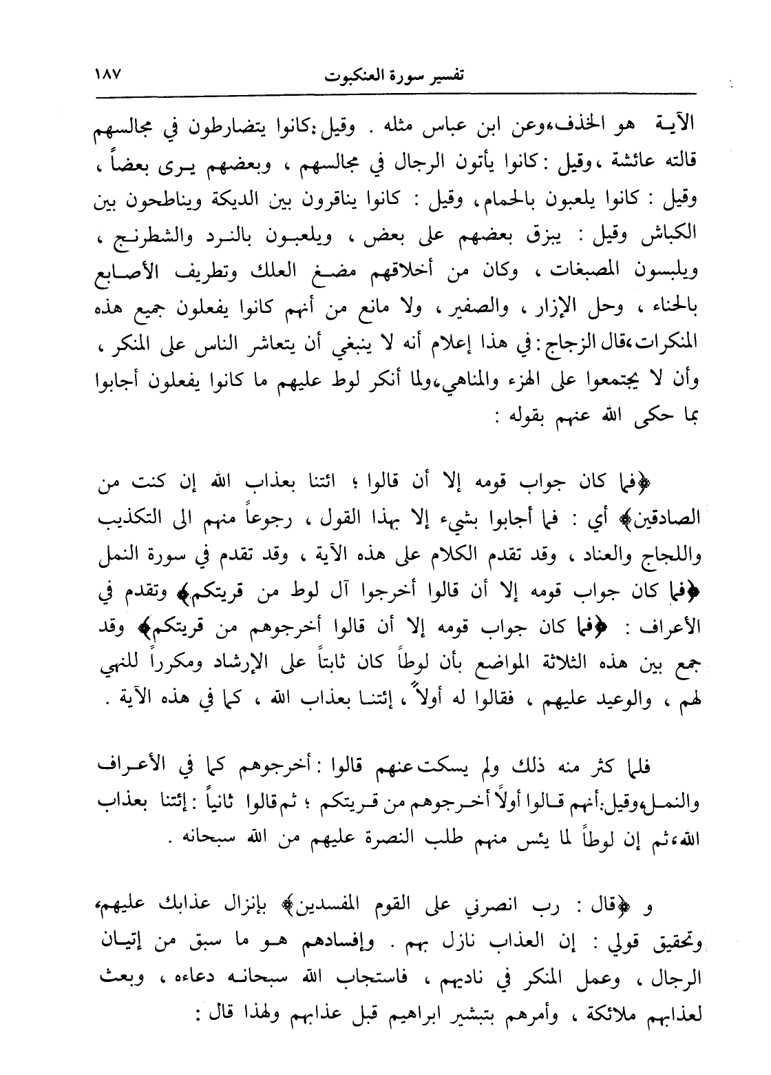(فما كان جواب قومه إلا أن قالوا ائتنا بعذاب الله إن كنت من الصادقين) أي: فما أجابوا بشيء إلا بهذا القول، رجوعاً منهم إلى التكذيب واللجاج والعناد، وقد تقدم الكلام على هذه الآية، وقد تقدم في سورة النمل (فما كان جواب قومه إلا أن قالوا أخرجوا آل لوط من قريتكم) وتقدم في الأعراف: (فما كان جواب قومه إلا أن قالوا أخرجوهم من قريتكم) وقد جمع بين هذه الثلاثة المواضع بأن لوطاً كان ثابتاً على الإرشاد ومكرراً للنهي لهم، والوعيد عليهم، فقالوا له أولاً، إئتنا بعذاب الله، كما في هذه الآية.