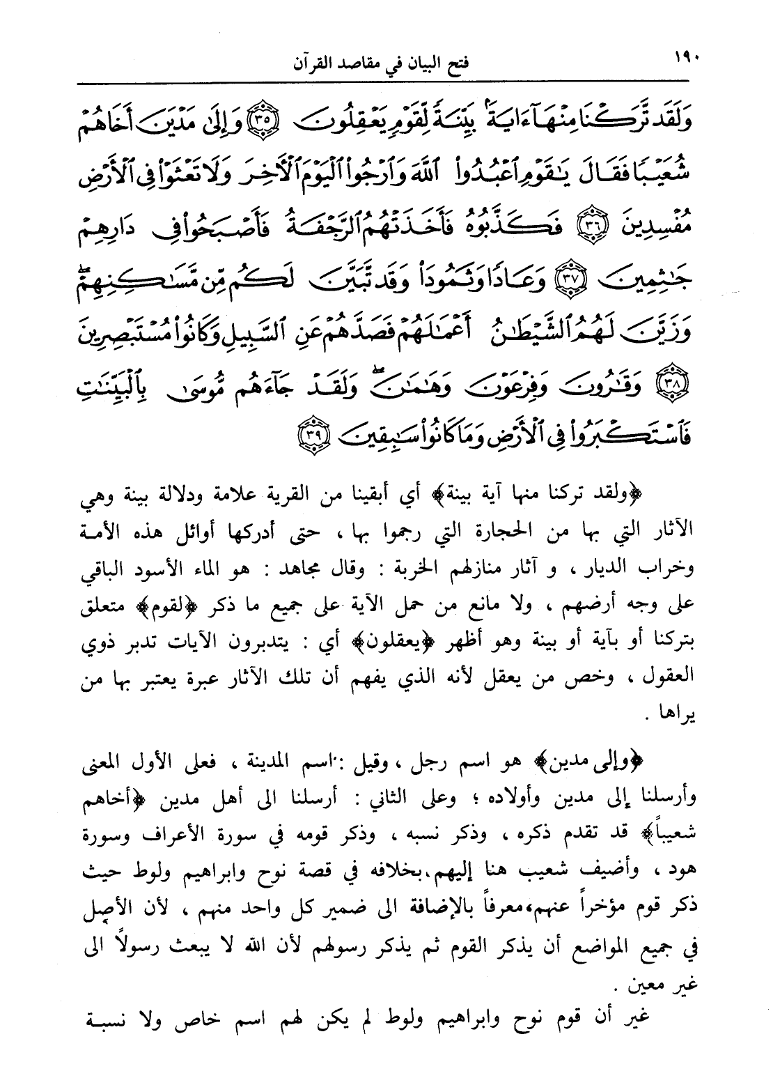 وَلَقَدْ تَرَكْنَا مِنْهَا آيَةً بَيِّنَةً لِقَوْمٍ يَعْقِلُونَ (35) وَإِلَى مَدْيَنَ أَخَاهُمْ شُعَيْبًا فَقَالَ يَا قَوْمِ اعْبُدُوا اللَّهَ وَارْجُوا الْيَوْمَ الْآخِرَ وَلَا تَعْثَوْا فِي الْأَرْضِ مُفْسِدِينَ (36) فَكَذَّبُوهُ فَأَخَذَتْهُمُ الرَّجْفَةُ فَأَصْبَحُوا فِي دَارِهِمْ جَاثِمِينَ (37) وَعَادًا وَثَمُودَ وَقَدْ تَبَيَّنَ لَكُمْ مِنْ مَسَاكِنِهِمْ وَزَيَّنَ لَهُمُ الشَّيْطَانُ أَعْمَالَهُمْ فَصَدَّهُمْ عَنِ السَّبِيلِ وَكَانُوا مُسْتَبْصِرِينَ (38) وَقَارُونَ وَفِرْعَوْنَ وَهَامَانَ وَلَقَدْ جَاءَهُمْ مُوسَى بِالْبَيِّنَاتِ فَاسْتَكْبَرُوا فِي الْأَرْضِ وَمَا كَانُوا سَابِقِينَ (39)