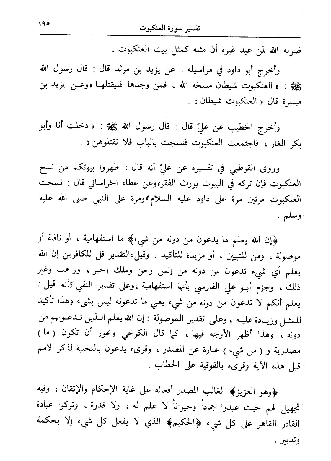 وروى القرطبي في تفسيره عن عليّ أنه قال: طهروا بيوتكم من نسج العنكبوت فإن تركه في البيوت يورث الفقر، وعن عطاء الخراساني قال: نسجت العنكبوت مرتين مرة على داود عليه السلام، ومرة على النبي صلى الله عليه وسلم.