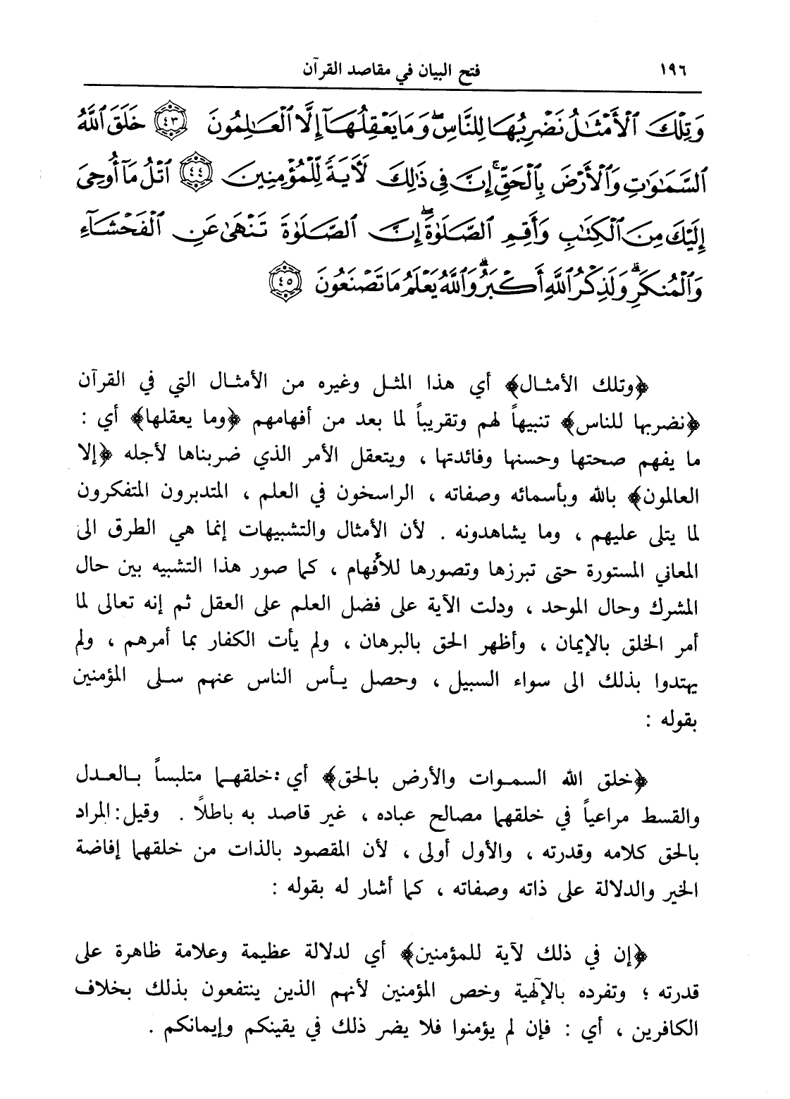وَتِلْكَ الْأَمْثَالُ نَضْرِبُهَا لِلنَّاسِ وَمَا يَعْقِلُهَا إِلَّا الْعَالِمُونَ (43) خَلَقَ اللَّهُ السَّمَاوَاتِ وَالْأَرْضَ بِالْحَقِّ إِنَّ فِي ذَلِكَ لَآيَةً لِلْمُؤْمِنِينَ (44) اتْلُ مَا أُوحِيَ إِلَيْكَ مِنَ الْكِتَابِ وَأَقِمِ الصَّلَاةَ إِنَّ الصَّلَاةَ تَنْهَى عَنِ الْفَحْشَاءِ وَالْمُنْكَرِ وَلَذِكْرُ اللَّهِ أَكْبَرُ وَاللَّهُ يَعْلَمُ مَا تَصْنَعُونَ (45)