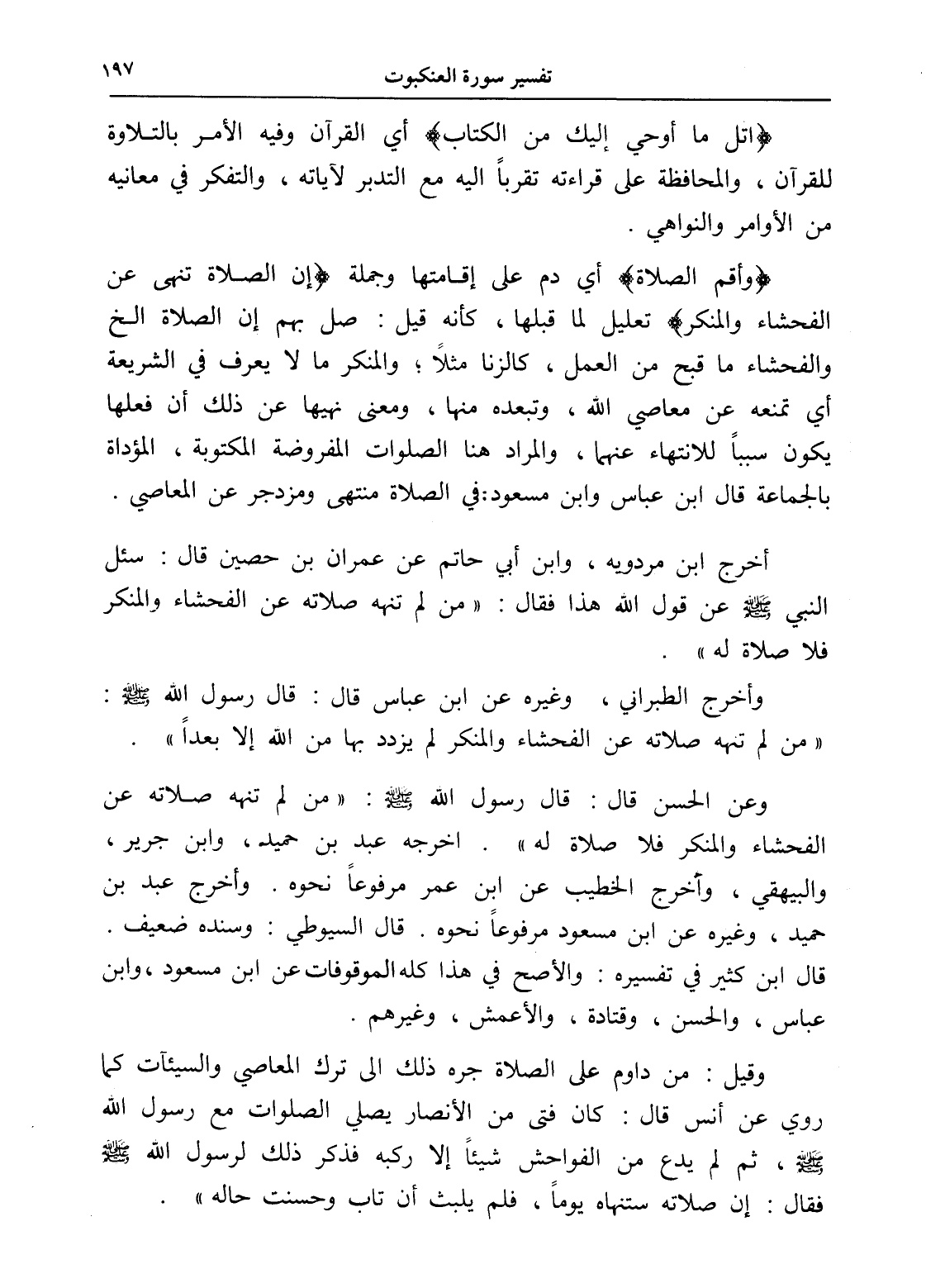 وعن الحسن قال: قال رسول الله - صلى الله عليه وسلم -: " من لم تنهه صلاته عن الفحشاء والمنكر فلا صلاة له ". أخرجه عبد بن حميده، وابن جرير، والبيهقي، وأخرج الخطب عن ابن عمر مرفوعاً نحوه. وأخرج عبد بن حميد، وغيره عن ابن مسعود مرفوعاً نحوه. قال السيوطي: وسنده ضعيف. قال ابن كثير في تفسيره: والأصح في هذا كله الموقوفات عن ابن مسعود، وابن عباس، والحسن، وقتادة، والأعمش، وغيرهم.