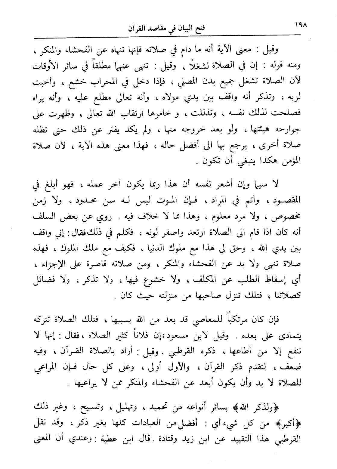 وقيل: معنى الآية أنه ما دام في صلاته فإنها تنهاه عن الفحشاء والمنكر، ومنه قوله: إن في الصلاة لشغلاً، وقيل: تنهى عنهما مطلقاً في سائر الأوقات لأن الصلاة تشغل جميع بدن المصلي، فإذا دخل في المحراب خشع، وأخبت لربه، وتذكر أنه واقف بين يدي مولاه، وأنه تعالى مطلع عليه، وأنه يراه فصلحت لذلك نفسه، وتذللت، وخامرها ارتقاب الله تعالى، وظهرت على جوارحه هيئتها، ولو بعد خروجه منها، ولم يكد يفتر عن ذلك حتى تظله صلاة أخرى، يرجع بها إلى أفضل حاله، فهذا معنى هذه الآية، لأن صلاة المؤمن هكذا ينبغي أن تكون.