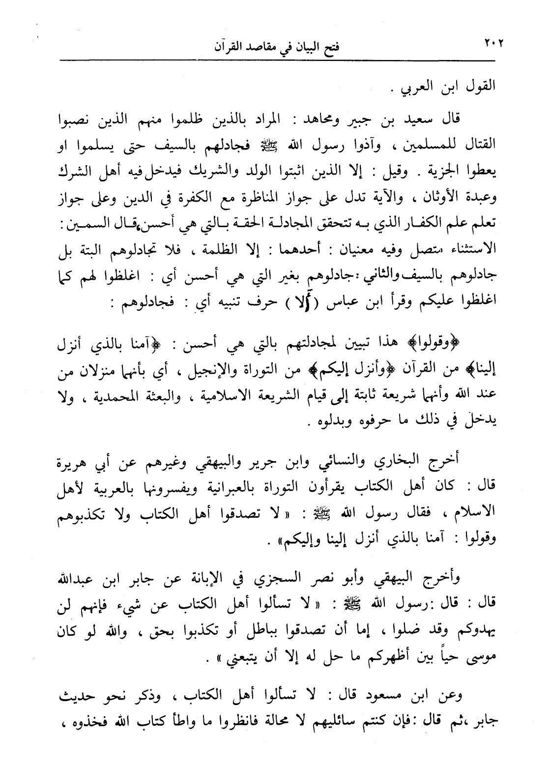 وأخرج البيهقي وأبو نصر السجزي في الإبانة عن جابر ابن عبد الله قال: قال: رسول الله - صلى الله عليه وسلم -: " لا تسألوا أهل الكتاب عن شيء فإنهم لن يهدوكم وقد ضلوا، إما أن تصدقوا بباطل أو تكذبوا بحق، والله لو كان موسى حياً بين أظهركم ما حل له إلا أن يتبعني ".