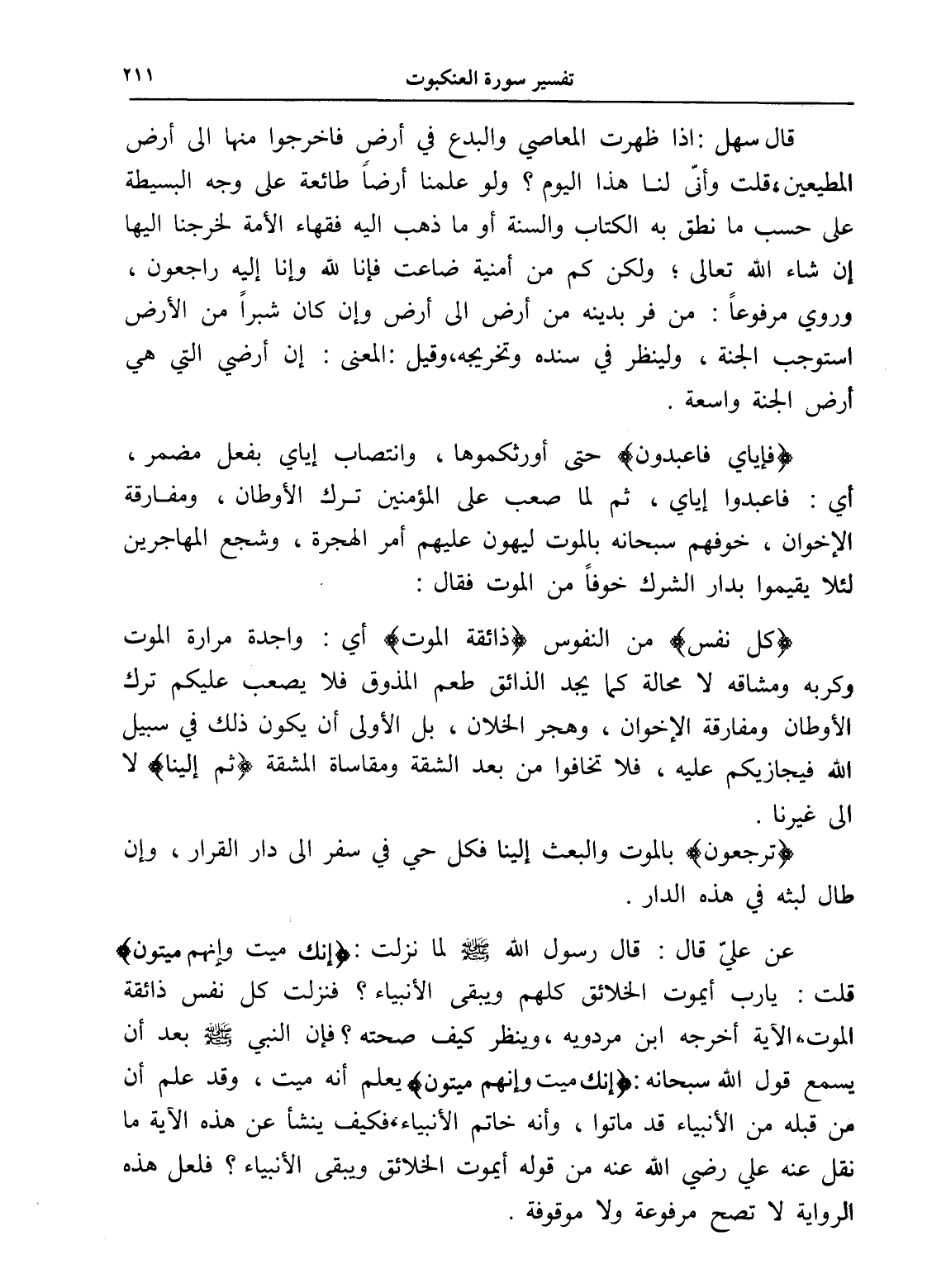 عن عليّ قال: قال رسول الله - صلى الله عليه وسلم - لما نزلت: (إنك ميت وإنهم ميتون) قلت: يا رب أيموت الخلائق كلهم ويبقى الأنبياء؟ فنزلت كل نفس ذائقة الموت، الآية أخرجه ابن مردويه، وينظر كيف صحته؟ فإن النبي - صلى الله عليه وسلم - بعد أن يسمع قول الله سبحانه: (إنك ميت وإنهم ميتون) يعلم أنه ميت، وقد علم أن من قبله من الأنبياء قد ماتوا، وأنه خاتم الأنبياء، فكيف ينشأ عن هذه الآية ما نقل عنه علي رضي الله عنه من قوله أيموت الخلائق ويبقى الأنبياء؟ فلعل هذه الرواية لا تصح مرفوعة ولا موقوفة.