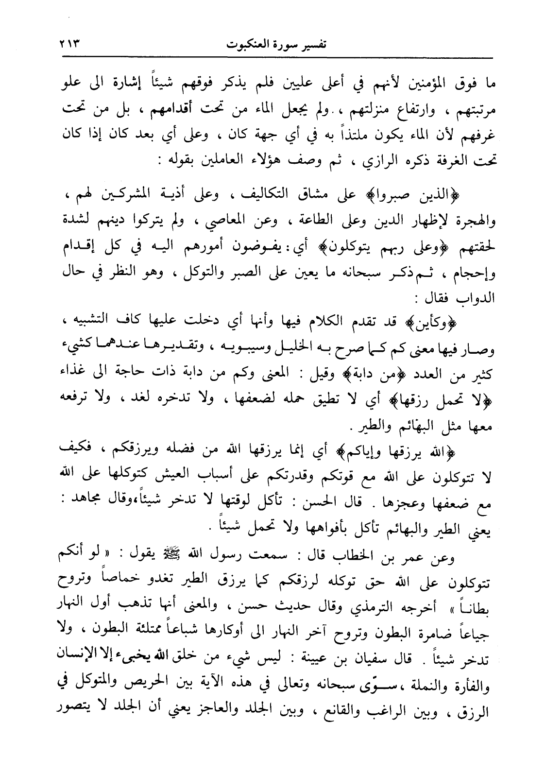 وعن عمر بن الخطاب قال: سمعت رسول الله - صلى الله عليه وسلم - يقول: " لو أنكم تتوكلون على الله حق توكله لرزقكم كما يرزق الطير تغدو خماصاً وتروح بطاناً " أخرجه الترمذي وقال حديث حسن، والمعنى أنها تذهب أول النهار جياعاً ضامرة البطون وتروح آخر النهار إلى أوكارها شباعاً ممتلئة البطون، ولا تدخر شيئاًً. قال سفيان بن عيينة: ليس شيء من خلق الله يخبئ إلا الإنسان والفأرة والنملة، سوى سبحانه وتعالى في هذه الآية بين الحريص والمتوكل في الرزق، وبين الراغب والقانع، وبين الجلد والعاجز يعني أن الجلد لا يتصور