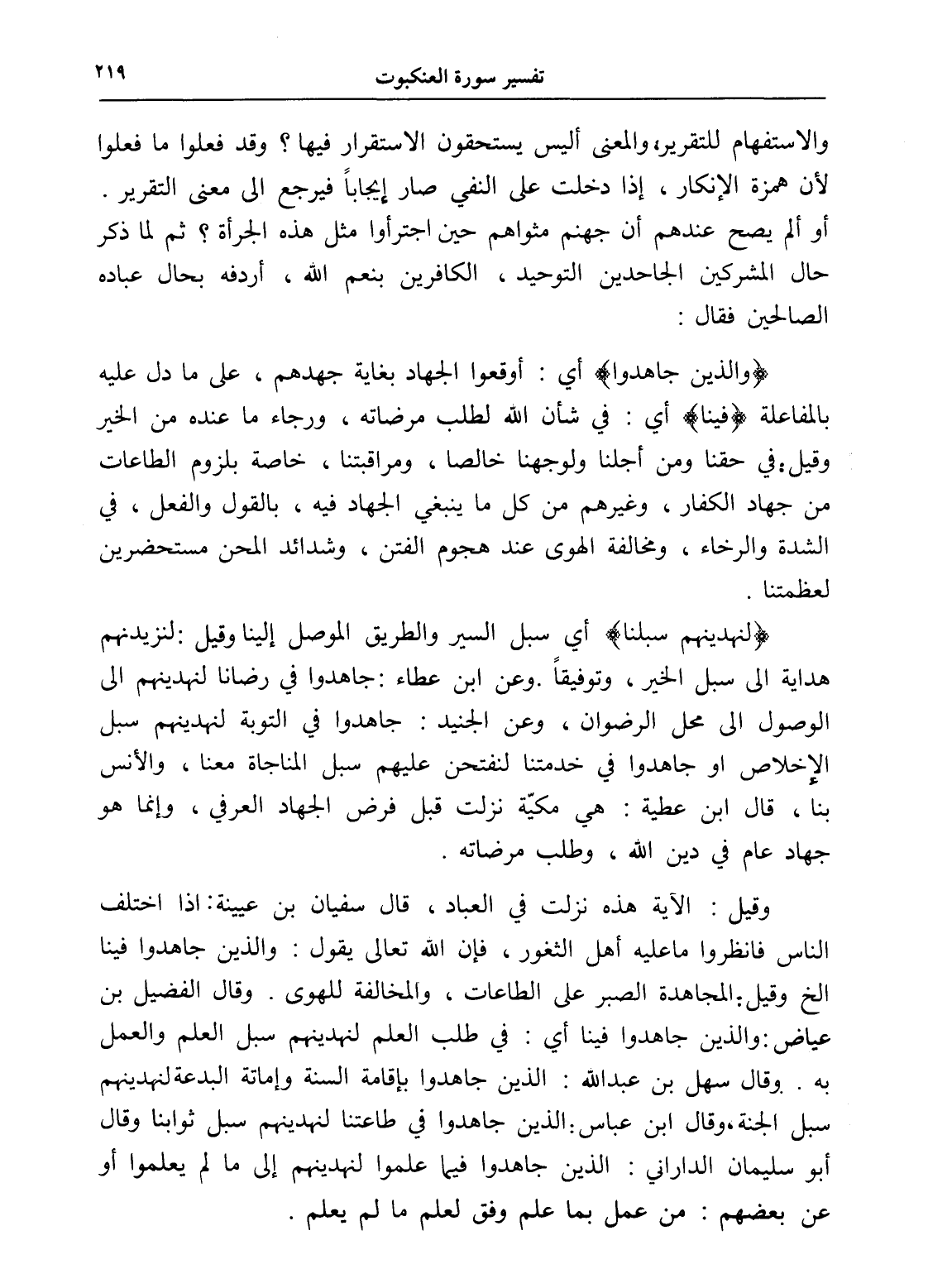 وقيل: الآية هذه نزلت في العباد، قال سفيان بن عيينة إذا اختلف الناس فانظروا ما عليه أهل الثغور، فإن الله تعالى يقول: والذين جاهدوا فينا الخ وقيل: المجاهدة الصبر على الطاعات، والمخالفة للهوى. وقال الفضيل بن عياض: والذين جاهدوا فينا أي: في طلب العلم لنهدينهم سبل العلم والعمل به. وقال سهل بن عبد الله: الذين جاهدوا بإقامة السنة وإماتة البدعة لنهدينهم سبل الجنة، وقال ابن عباس: الذين جاهدوا في طاعتنا لنهدينهم سبل ثوابنا وقال أبو سليمان الداراني: الذين جاهدوا فيما علموا لنهدينهم إلى ما لم يعلموا أو عن بعضهم: من عمل بما علم وفق لعلم ما لم يعلم.