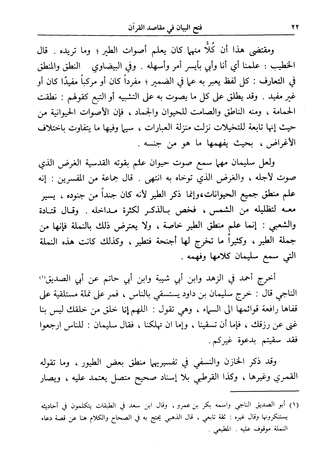 ومقتضى هذا أن كُلاًّ منهما كان يعلم أصوات الطير؛ وما تريده. قال الخطيب: علمنا أي أنا وأبي بأيسر أمر وأسهله. وفي البيضاوي النطق والمنطق في التعارف: كل لفظ يعبر به عما في الضمير؛ مفرداً كان أو مركباً مفيداً كان أو غير مفيد. وقد يطلق على كل ما يصوت به على التشبيه أو التبع كقولهم: نطقت الحمامة، ومنه الناطق والصامت للحيوان والجماد، فإن الأصوات الحيوانية من حيث إنها تابعة للتخيلات نزلت منزلة العبارات، سيما وفيها ما يتفاوت باختلاف الأغراض، بحيث يفهمها ما هو من جنسه.