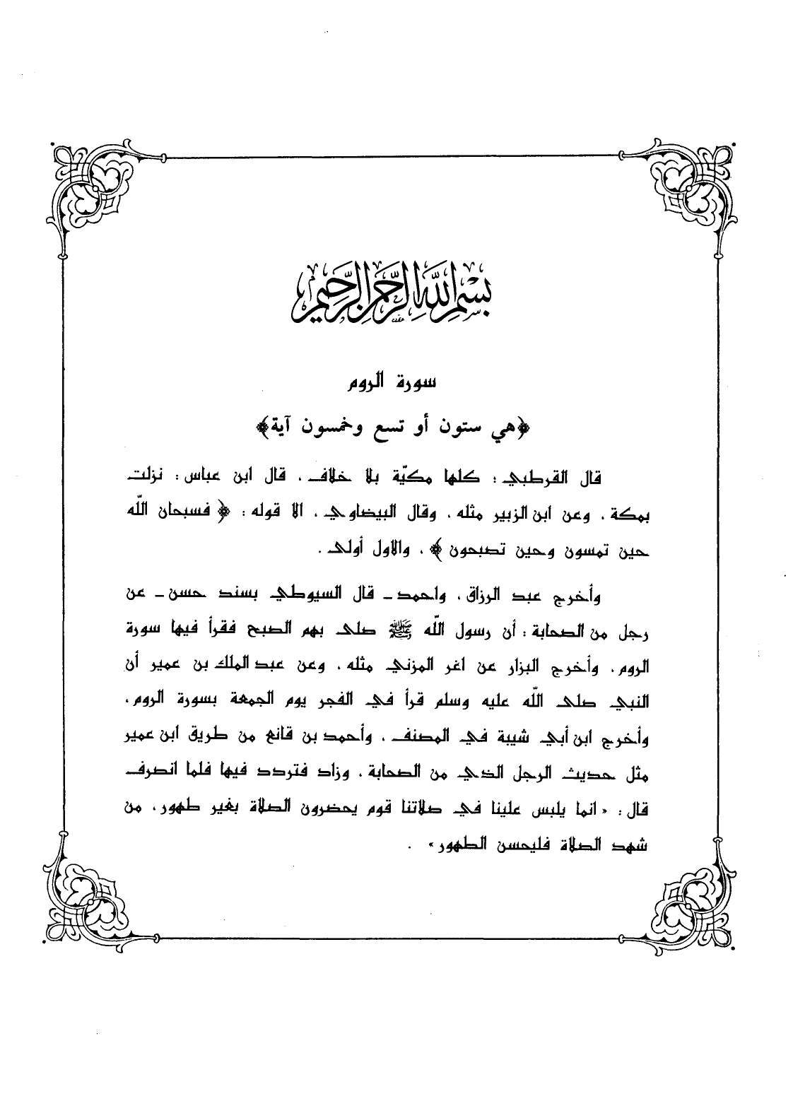 وأخرج عبد الرزاق، وأحمد -قال السيوطي بسند حسن- عن رجل من الصحابة: أن رسول الله - صلى الله عليه وسلم - صلى بهم الصبح فقرأ فيها سورة الروم، وأخرج البزار عن أغر المزني مثله، وعن عبد الملك بن عمير أن النبي - صلى الله عليه وسلم - قرأ في الفجر يوم الجمعة بسورة الروم، وأخرج ابن أبي شيبة في المصنف، وأحمد بن قانع من طريق ابن عمير مثل حديث الرجل الذي من الصحابة، وزاد فتردد فيها فلما انصرف قال: " إنما يلبس علينا في صلاتنا قوم يحضرون الصلاة بغير طهور، من شهد الصلاة فليحسن الطهور ".
