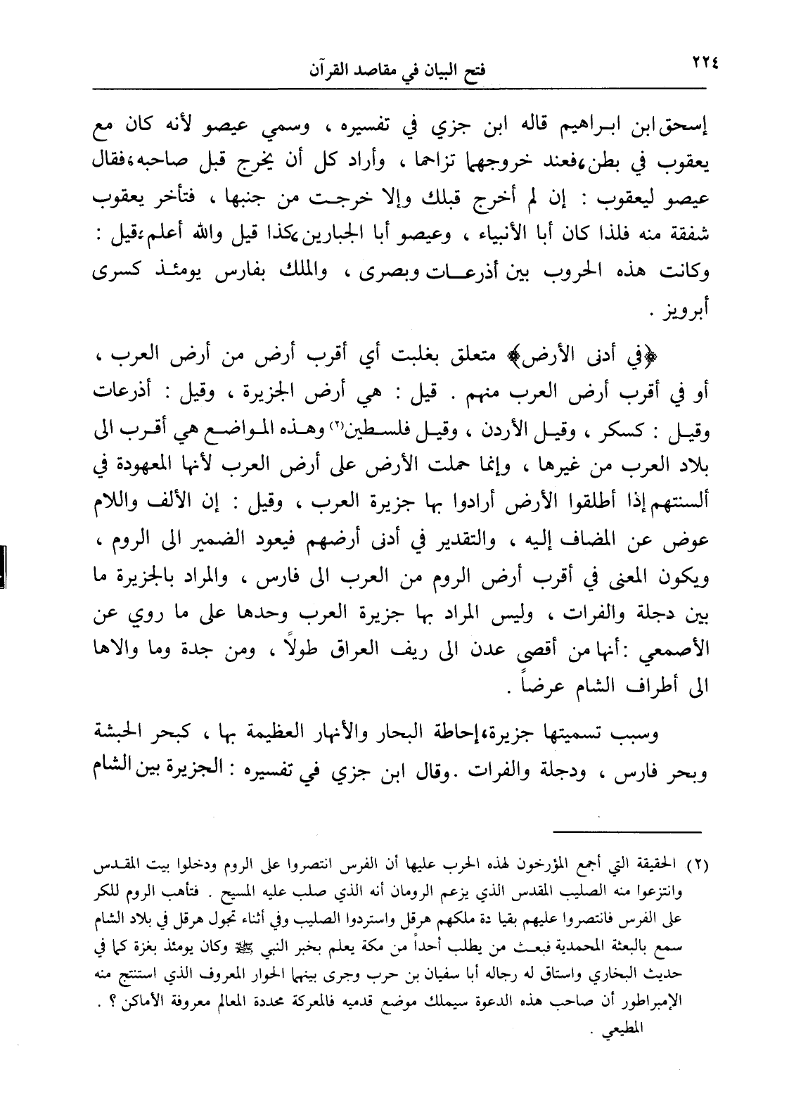 (¬1) الحقيقة التي أجمع المؤرخون لهذه الحرب عليها أن الفرس انتصروا على الروم ودخلوا بيت المقدس وانتزعوا منه الصليب المقدس الذي يزعم الرومان أنه الذي صلب عليه المسيح. فتأهب الروم للكر على الفرس فانتصروا عليهم بقيادة ملكهم هرقل واستردوا الصليب وفي أثناء تجول هرقل في بلاد الشام سمع بالبعثة المحمدية فبعث من يطلب أحداً من مكة يعلم بخبر النبي - صلى الله عليه وسلم - وكان يومئذ بغزة كما في حديث البخاري واستاق له رجاله أبا سفيان بن حرب وجرى بينهما الحوار المعروف الذي استنتج منه الإمبراطور أن صاحب هذه الدعوة سيملك موضع قدميه فالمعركة محددة المعالم معروفة الأماكن؟. المطيعي.