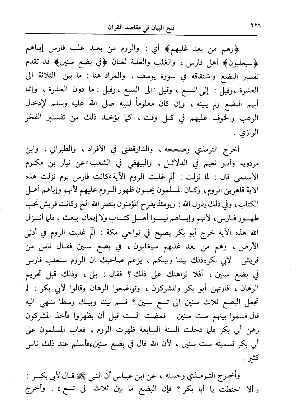 أخرج الترمذي وصححه، والدارقطني في الأفراد، والطبراني، وابن مردويه وأبو نعيم في الدلائل، والبيهقي في الشعب، عن نيار بن مكرم الأسلمي قال: لما نزلت: الم غلبت الروم الآية، كانت فارس يوم نزلت هذه الآية قاهرين الروم، وكان المسلمون يحبون ظهور الروم عليهم لأنهم وإياهم أهل الكتاب، وفي ذلك يقول الله: ويومئذ يفرح المؤمنون بنصر الله الخ وكانت قريش تحب ظهور فارس، لأنهم وإياهم ليسوا أهل كتاب ولا إيمان ببعث، فلما أنزل الله هذه الآية خرج أبو بكر يصيح في نواحي مكة: الم غلبت الروم في أدنى الأرض، وهم من بعد غلبهم سيغلبون، في بضع سنين فقال ناس من قريش لأبي بكر: ذلك بيننا وبينكم، يزعم صاحبك أن الروم ستغلب فارس في بضع سنين، أفلا نراهنك على ذلك؟ فقال: بلى، وذلك قبل تحريم الرهان، فارتهن أبو بكر والمشركون، وتواضعوا الرهان وقالوا لأبي بكر: لم تجعل البضع ثلاث سنين إلى تسع سنين؟ فسم بيننا وبينك وسطاً ننتهي إليه قال فسموا بينهم ست سنين فمضت الست قبل أن يظهروا فأخذ المشركون رهن أبي بكر فلما دخلت السنة السابعة ظهرت الروم، فعاب المسلمون على أبي بكر تسميته ست سنين، لأن الله قال في بضع سنين، فأسلم عند ذلك ناس كثير.