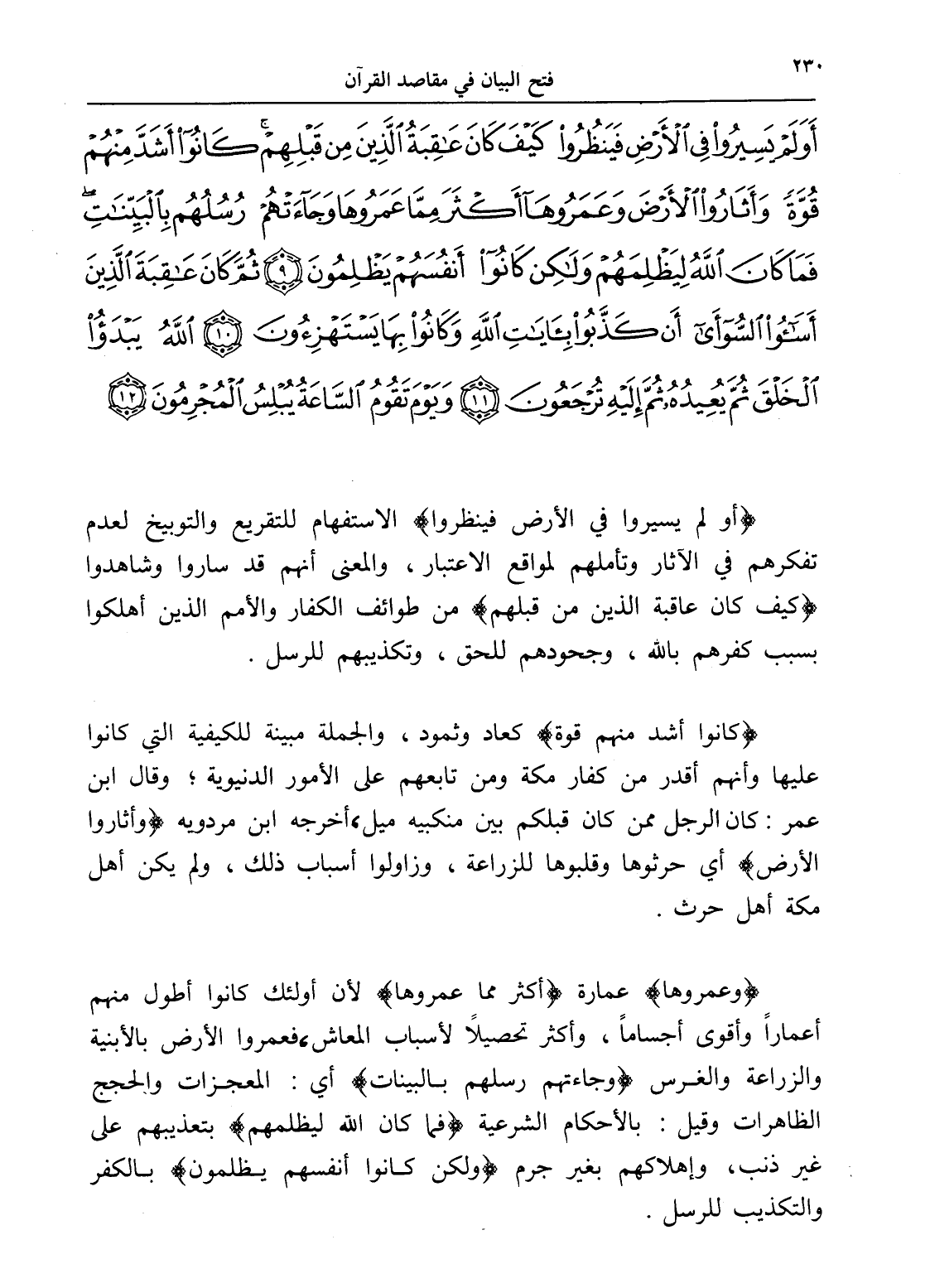 أَوَلَمْ يَسِيرُوا فِي الْأَرْضِ فَيَنْظُرُوا كَيْفَ كَانَ عَاقِبَةُ الَّذِينَ مِنْ قَبْلِهِمْ كَانُوا أَشَدَّ مِنْهُمْ قُوَّةً وَأَثَارُوا الْأَرْضَ وَعَمَرُوهَا أَكْثَرَ مِمَّا عَمَرُوهَا وَجَاءَتْهُمْ رُسُلُهُمْ بِالْبَيِّنَاتِ فَمَا كَانَ اللَّهُ لِيَظْلِمَهُمْ وَلَكِنْ كَانُوا أَنْفُسَهُمْ يَظْلِمُونَ (9) ثُمَّ كَانَ عَاقِبَةَ الَّذِينَ أَسَاءُوا السُّوأَى أَنْ كَذَّبُوا بِآيَاتِ اللَّهِ وَكَانُوا بِهَا يَسْتَهْزِئُونَ (10) اللَّهُ يَبْدَأُ الْخَلْقَ ثُمَّ يُعِيدُهُ ثُمَّ إِلَيْهِ تُرْجَعُونَ (11) وَيَوْمَ تَقُومُ السَّاعَةُ يُبْلِسُ الْمُجْرِمُونَ (12)