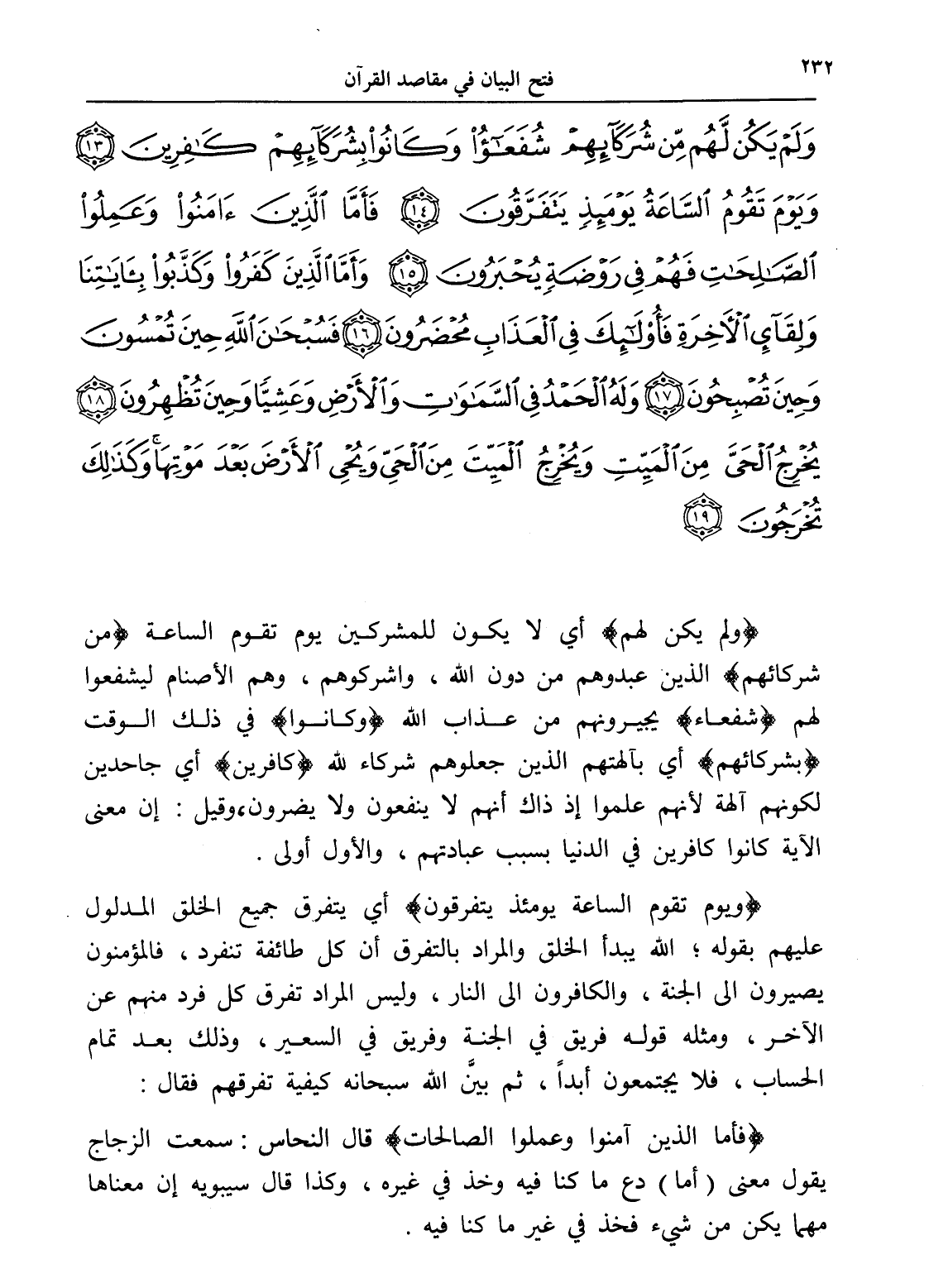 وَلَمْ يَكُنْ لَهُمْ مِنْ شُرَكَائِهِمْ شُفَعَاءُ وَكَانُوا بِشُرَكَائِهِمْ كَافِرِينَ (13) وَيَوْمَ تَقُومُ السَّاعَةُ يَوْمَئِذٍ يَتَفَرَّقُونَ (14) فَأَمَّا الَّذِينَ آمَنُوا وَعَمِلُوا الصَّالِحَاتِ فَهُمْ فِي رَوْضَةٍ يُحْبَرُونَ (15) وَأَمَّا الَّذِينَ كَفَرُوا وَكَذَّبُوا بِآيَاتِنَا وَلِقَاءِ الْآخِرَةِ فَأُولَئِكَ فِي الْعَذَابِ مُحْضَرُونَ (16) فَسُبْحَانَ اللَّهِ حِينَ تُمْسُونَ وَحِينَ تُصْبِحُونَ (17) وَلَهُ الْحَمْدُ فِي السَّمَاوَاتِ وَالْأَرْضِ وَعَشِيًّا وَحِينَ تُظْهِرُونَ (18) يُخْرِجُ الْحَيَّ مِنَ الْمَيِّتِ وَيُخْرِجُ الْمَيِّتَ مِنَ الْحَيِّ وَيُحْيِ الْأَرْضَ بَعْدَ مَوْتِهَا وَكَذَلِكَ تُخْرَجُونَ (19)