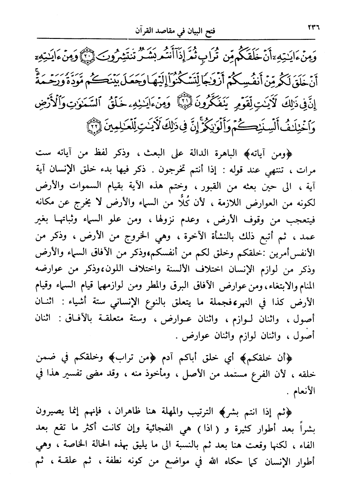 وَمِنْ آيَاتِهِ أَنْ خَلَقَكُمْ مِنْ تُرَابٍ ثُمَّ إِذَا أَنْتُمْ بَشَرٌ تَنْتَشِرُونَ (20) وَمِنْ آيَاتِهِ أَنْ خَلَقَ لَكُمْ مِنْ أَنْفُسِكُمْ أَزْوَاجًا لِتَسْكُنُوا إِلَيْهَا وَجَعَلَ بَيْنَكُمْ مَوَدَّةً وَرَحْمَةً إِنَّ فِي ذَلِكَ لَآيَاتٍ لِقَوْمٍ يَتَفَكَّرُونَ (21) وَمِنْ آيَاتِهِ خَلْقُ السَّمَاوَاتِ وَالْأَرْضِ وَاخْتِلَافُ أَلْسِنَتِكُمْ وَأَلْوَانِكُمْ إِنَّ فِي ذَلِكَ لَآيَاتٍ لِلْعَالِمِينَ (22)