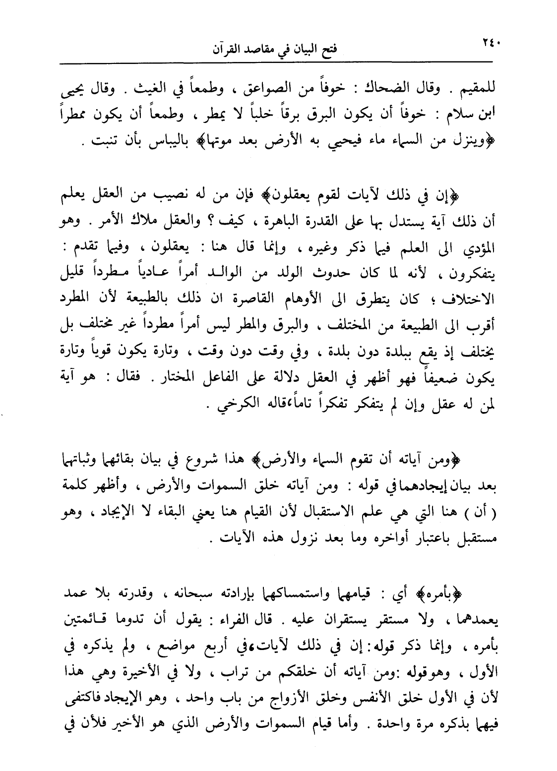 للمقيم. وقال الضحاك: خوفاً من الصواعق، وطمعاً في الغيث. وقال يحيى ابن سلام: خوفاً أن يكون البرق برقاً خلباً لا يمطر، وطمعاً أن يكون ممطراً (وينزل من السماء ماء فيحيي به الأرض بعد موتها) باليباس بأن تنبت.