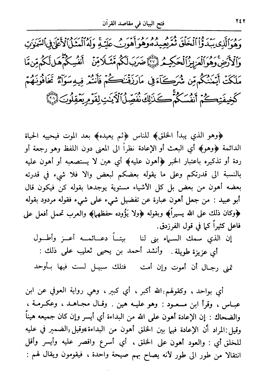 وَهُوَ الَّذِي يَبْدَأُ الْخَلْقَ ثُمَّ يُعِيدُهُ وَهُوَ أَهْوَنُ عَلَيْهِ وَلَهُ الْمَثَلُ الْأَعْلَى فِي السَّمَاوَاتِ وَالْأَرْضِ وَهُوَ الْعَزِيزُ الْحَكِيمُ (27) ضَرَبَ لَكُمْ مَثَلًا مِنْ أَنْفُسِكُمْ هَلْ لَكُمْ مِنْ مَا مَلَكَتْ أَيْمَانُكُمْ مِنْ شُرَكَاءَ فِي مَا رَزَقْنَاكُمْ فَأَنْتُمْ فِيهِ سَوَاءٌ تَخَافُونَهُمْ كَخِيفَتِكُمْ أَنْفُسَكُمْ كَذَلِكَ نُفَصِّلُ الْآيَاتِ لِقَوْمٍ يَعْقِلُونَ (28)