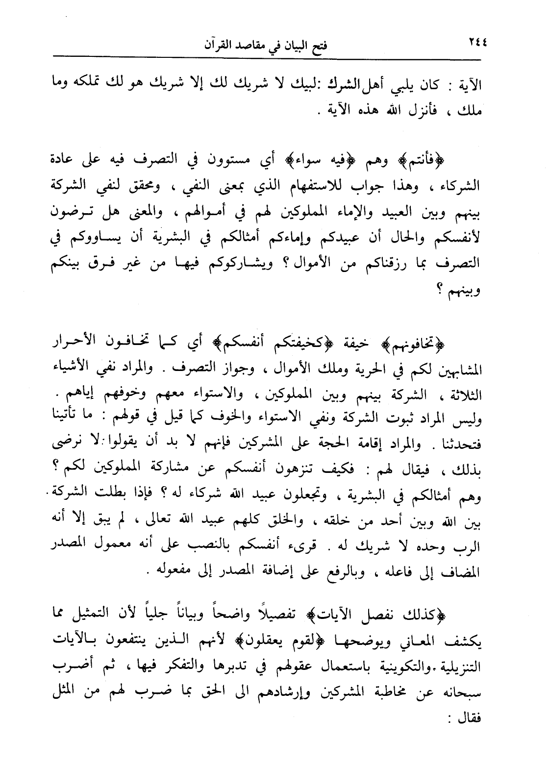(تخافونهم) خيفة (كخيفتكم أنفسكم) أي كما تخافون الأحرار المشابهين لكم في الحرية وملك الأموال، وجواز التصرف. والمراد نفي الأشياء الثلاثة، الشركة بينهم وبين المملوكين، والاستواء معهم وخوفهم إياهم. وليس المراد ثبوت الشركة ونفي الاستواء والخوف كما قيل في قولهم: ما تأتينا فتحدثنا. والمراد إقامة الحجة على المشركين فإنهم لا بد أن يقولوا: لا نرضى بذلك، فيقال لهم: فكيف تنزهون أنفسكم عن مشاركة المملوكين لكم؟ وهم أمثالكم في البشرية، وتجعلون عبيد الله شركاء له؟ فإذا بطلت الشركة. بين الله وبين أحد من خلقه، والخلق كلهم عبيد الله تعالى، لم يبق إلا أنه الرب وحده لا شريك له. قرئ أنفسكم بالنصب على أنه معمول المصدر المضاف إلى فاعله، وبالرفع على إضافة المصدر إلى مفعوله.