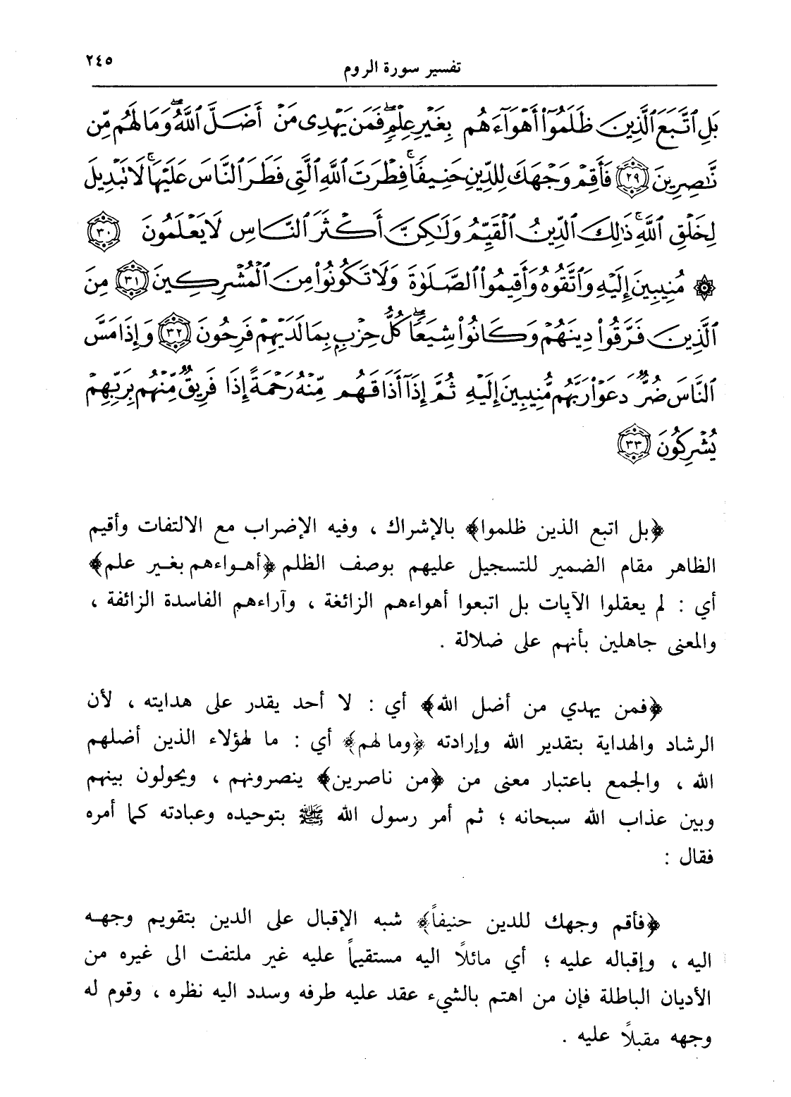 بَلِ اتَّبَعَ الَّذِينَ ظَلَمُوا أَهْوَاءَهُمْ بِغَيْرِ عِلْمٍ فَمَنْ يَهْدِي مَنْ أَضَلَّ اللَّهُ وَمَا لَهُمْ مِنْ نَاصِرِينَ (29) فَأَقِمْ وَجْهَكَ لِلدِّينِ حَنِيفًا فِطْرَتَ اللَّهِ الَّتِي فَطَرَ النَّاسَ عَلَيْهَا لَا تَبْدِيلَ لِخَلْقِ اللَّهِ ذَلِكَ الدِّينُ الْقَيِّمُ وَلَكِنَّ أَكْثَرَ النَّاسِ لَا يَعْلَمُونَ (30) مُنِيبِينَ إِلَيْهِ وَاتَّقُوهُ وَأَقِيمُوا الصَّلَاةَ وَلَا تَكُونُوا مِنَ الْمُشْرِكِينَ (31) مِنَ الَّذِينَ فَرَّقُوا دِينَهُمْ وَكَانُوا شِيَعًا كُلُّ حِزْبٍ بِمَا لَدَيْهِمْ فَرِحُونَ (32) وَإِذَا مَسَّ النَّاسَ ضُرٌّ دَعَوْا رَبَّهُمْ مُنِيبِينَ إِلَيْهِ ثُمَّ إِذَا أَذَاقَهُمْ مِنْهُ رَحْمَةً إِذَا فَرِيقٌ مِنْهُمْ بِرَبِّهِمْ يُشْرِكُونَ (33)