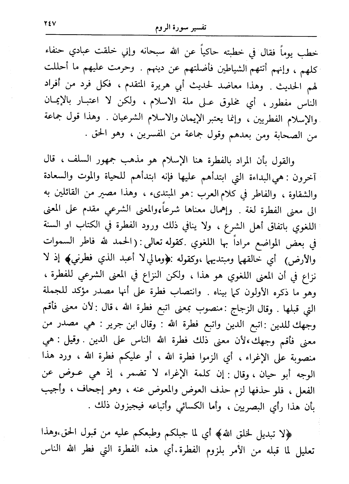 والقول بأن المراد بالفطرة هنا الإسلام هو مذهب جمهور السلف، قال آخرون: هي البداءة التي ابتدأهم عليها فإنه ابتدأهم للحياة والموت والسعادة والشقاوة، والفاطر في كلام العرب: هو المبتدئ، وهذا مصير من القائلين به إلى معنى الفطرة لغة. وإهمال معناها شرعاً، والمعنى الشرعي مقدم على المعنى اللغوي باتفاق أهل الشرع، ولا ينافي ذلك ورود الفطرة في الكتاب أو السنة في بعض المواضع مراداً بها اللغوي. كقوله تعالى: (الحمد لله فاطر السماوات والأرض) أي خالقهما ومبتديهما، وكقوله: (وما لي لا أعبد الذي فطرني) إذ لا نزاع في أن المعنى اللغوي هو هذا، ولكن النزاع في المعنى الشرعي للفطرة، وهو ما ذكره الأولون كما بيناه. وانتصاب فطرة على أنها مصدر مؤكد للجملة التي قبلها. وقال الزجاج: منصوب بمعنى اتبع فطرة الله، قال: لأن معنى فأقم وجهك للدين: اتبع الدين واتبع فطرة الله: وقال ابن جرير: هي مصدر من معنى فأقم وجهك، لأن معنى ذلك فطرة الله الناس على الدين. وقيل: هي منصوبة على الإغراء، أي الزموا فطرة الله، أو عليكم فطرة الله، ورد هذا الوجه أبو حيان، وقال: إن كلمة الإغراء لا تضمر، إذ هي عوض عن الفعل، فلو حذفها لزم حذف العوض والمعوض عنه، وهو إجحاف، وأجيب بأن هذا رأي البصريين، وأما الكسائي وأتباعه فيجيزون ذلك.