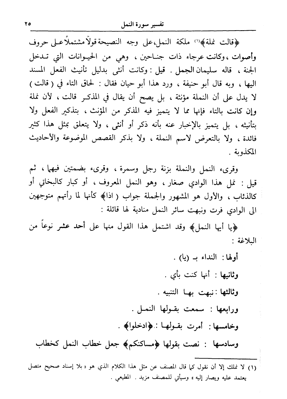 (يا أيها النمل) وقد اشتمل هذا القول منها على أحد عشر نوعاً من البلاغة: