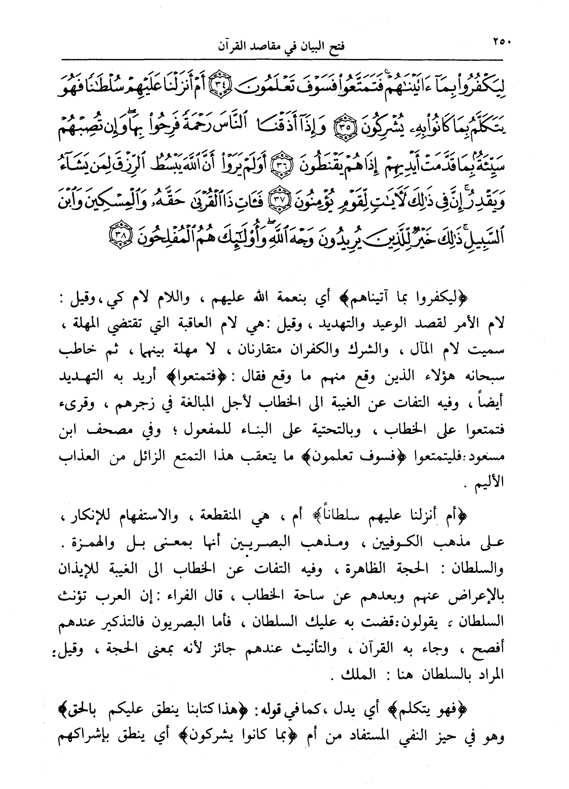 لِيَكْفُرُوا بِمَا آتَيْنَاهُمْ فَتَمَتَّعُوا فَسَوْفَ تَعْلَمُونَ (34) أَمْ أَنْزَلْنَا عَلَيْهِمْ سُلْطَانًا فَهُوَ يَتَكَلَّمُ بِمَا كَانُوا بِهِ يُشْرِكُونَ (35) وَإِذَا أَذَقْنَا النَّاسَ رَحْمَةً فَرِحُوا بِهَا وَإِنْ تُصِبْهُمْ سَيِّئَةٌ بِمَا قَدَّمَتْ أَيْدِيهِمْ إِذَا هُمْ يَقْنَطُونَ (36) أَوَلَمْ يَرَوْا أَنَّ اللَّهَ يَبْسُطُ الرِّزْقَ لِمَنْ يَشَاءُ وَيَقْدِرُ إِنَّ فِي ذَلِكَ لَآيَاتٍ لِقَوْمٍ يُؤْمِنُونَ (37) فَآتِ ذَا الْقُرْبَى حَقَّهُ وَالْمِسْكِينَ وَابْنَ السَّبِيلِ ذَلِكَ خَيْرٌ لِلَّذِينَ يُرِيدُونَ وَجْهَ اللَّهِ وَأُولَئِكَ هُمُ الْمُفْلِحُونَ (38)