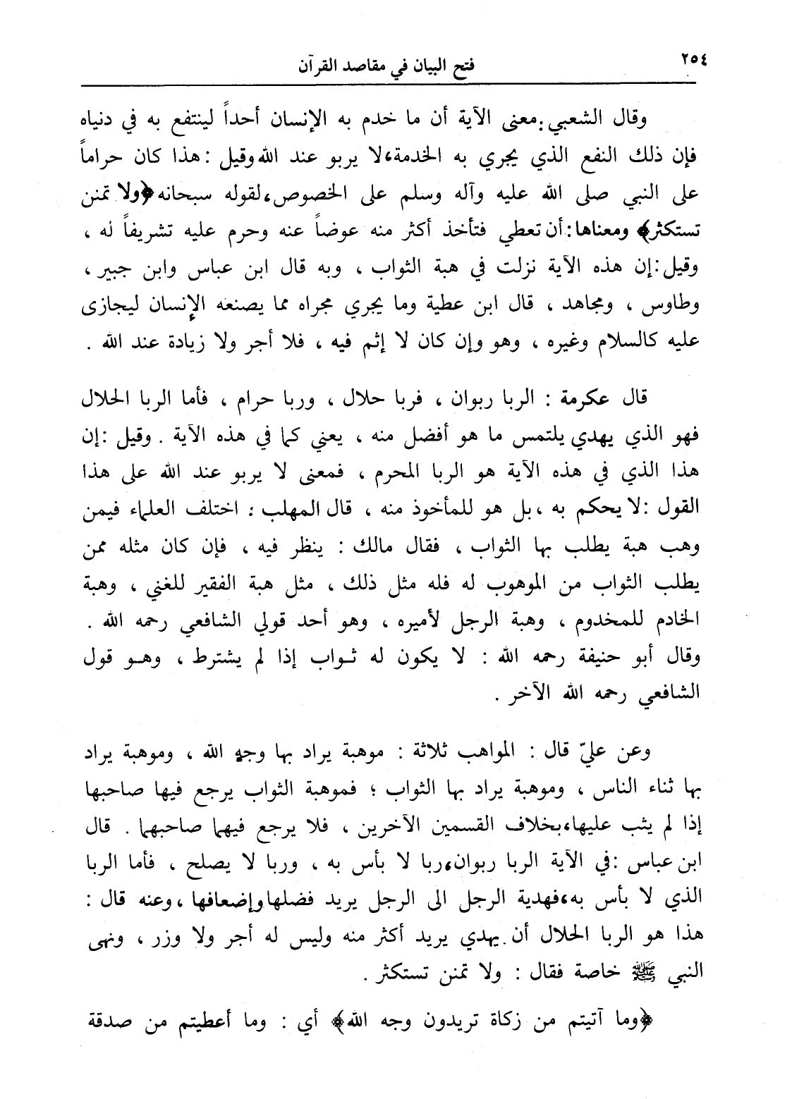 وعن عليّ قال: المواهب ثلاثة: موهبة يراد بها وجه الله، وموهبة يراد بها ثناء الناس، وموهبة يراد بها الثواب؛ فموهبة الثواب يرجع فيها صاحبها إذا لم يثب عليها، بخلاف القسمين الآخرين، فلا يرجع فيهما صاحبهما. قال ابن عباس: في الآية الربا ربوان، ربا لا بأس به، وربا لا يصلح، فأما الربا الذي لا بأس به، فهدية الرجل إلى الرجل يريد فضلها وإضعافها، وعنه قال: هذا هو الربا الحلال أن يهدي يريد أكثر منه وليس له أجر ولا وزر، ونهى النبي - صلى الله عليه وسلم - خاصة فقال: ولا تمنن تستكثر.