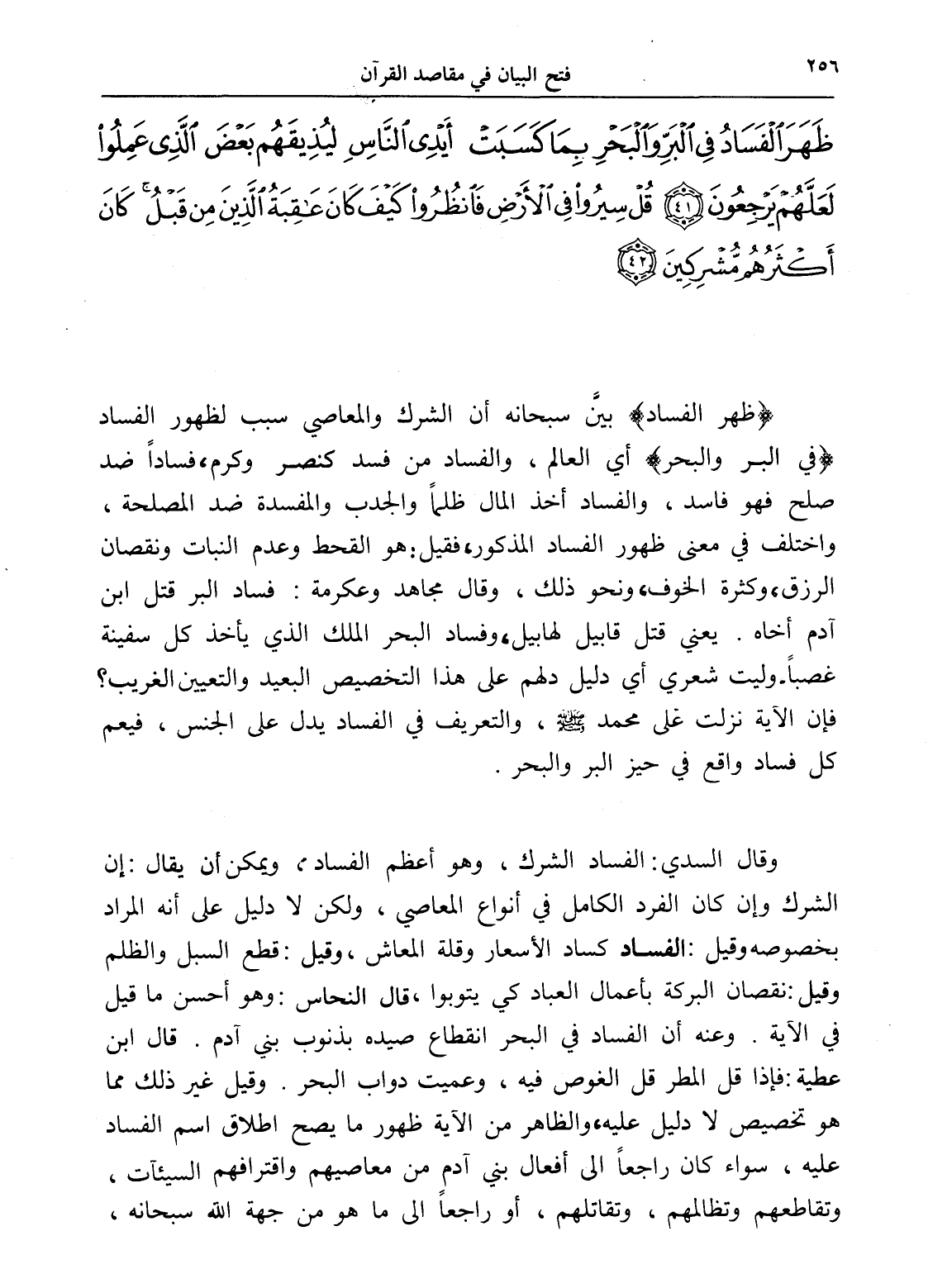 ظَهَرَ الْفَسَادُ فِي الْبَرِّ وَالْبَحْرِ بِمَا كَسَبَتْ أَيْدِي النَّاسِ لِيُذِيقَهُمْ بَعْضَ الَّذِي عَمِلُوا لَعَلَّهُمْ يَرْجِعُونَ (41) قُلْ سِيرُوا فِي الْأَرْضِ فَانْظُرُوا كَيْفَ كَانَ عَاقِبَةُ الَّذِينَ مِنْ قَبْلُ كَانَ أَكْثَرُهُمْ مُشْرِكِينَ (42)