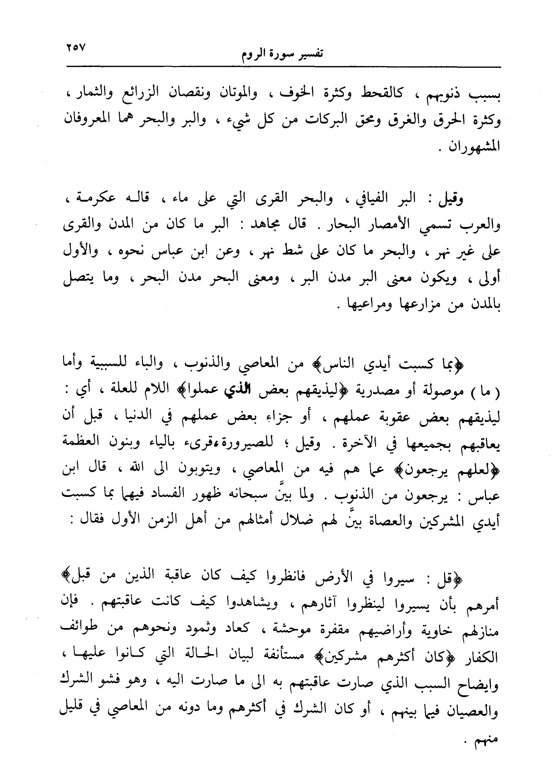 وقيل: البر الفيافي، والبحر القرى التي على ماء، قاله عكرمة، والعرب تسمي الأمصار البحار. قال مجاهد: البر ما كان من المدن والقرى على غير نهر، والبحر ما كان على شط نهر، وعن ابن عباس نحوه، والأول أولى، ويكون معنى البر مدن البر، ومعنى البحر مدن البحر، وما يتصل بالمدن من مزارعها ومراعيها.