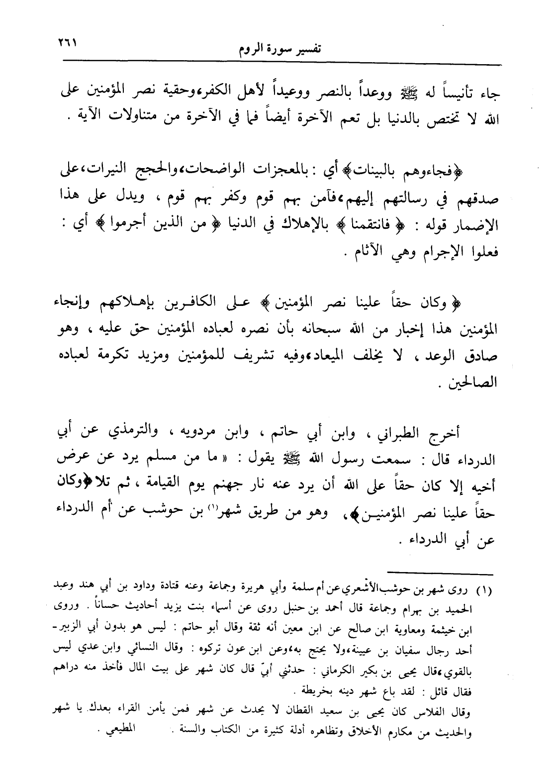أخرج الطبراني، وابن أبي حاتم، وابن مردويه، والترمذي عن أبي الدرداء قال: سمعت رسول الله - صلى الله عليه وسلم - يقول: " ما من مسلم يرد عن عرض أخيه إلا كان حقاً على الله أن يرد عنه نار جهنم يوم القيامة، ثم تلا (وكان حقاً علينا نصر المؤمنين) "، وهو من طريق شهر (¬1) بن حوشب عن أم الدرداء عن أبي الدرداء.