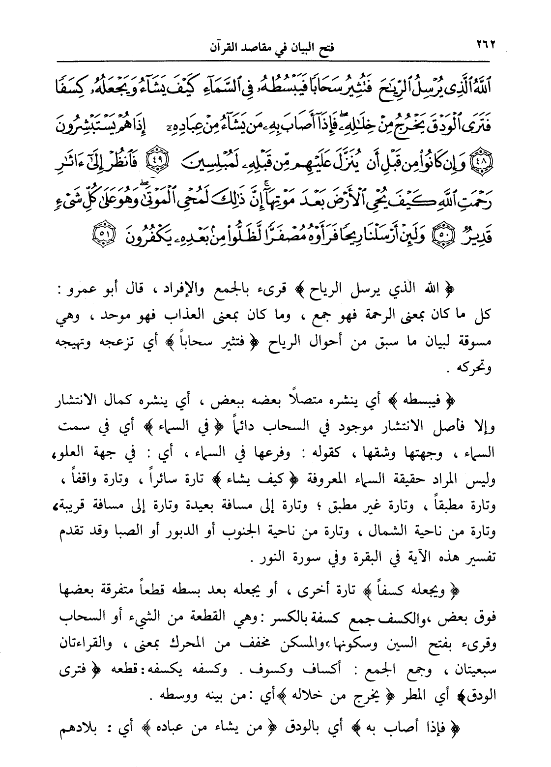 اللَّهُ الَّذِي يُرْسِلُ الرِّيَاحَ فَتُثِيرُ سَحَابًا فَيَبْسُطُهُ فِي السَّمَاءِ كَيْفَ يَشَاءُ وَيَجْعَلُهُ كِسَفًا فَتَرَى الْوَدْقَ يَخْرُجُ مِنْ خِلَالِهِ فَإِذَا أَصَابَ بِهِ مَنْ يَشَاءُ مِنْ عِبَادِهِ إِذَا هُمْ يَسْتَبْشِرُونَ (48) وَإِنْ كَانُوا مِنْ قَبْلِ أَنْ يُنَزَّلَ عَلَيْهِمْ مِنْ قَبْلِهِ لَمُبْلِسِينَ (49) فَانْظُرْ إِلَى آثَارِ رَحْمَتِ اللَّهِ كَيْفَ يُحْيِ الْأَرْضَ بَعْدَ مَوْتِهَا إِنَّ ذَلِكَ لَمُحْيِ الْمَوْتَى وَهُوَ عَلَى كُلِّ شَيْءٍ قَدِيرٌ (50) وَلَئِنْ أَرْسَلْنَا رِيحًا فَرَأَوْهُ مُصْفَرًّا لَظَلُّوا مِنْ بَعْدِهِ يَكْفُرُونَ (51)