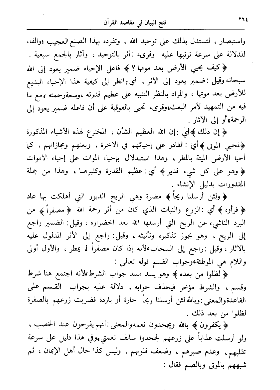 (يكفرون) بالله ويجحدون نعمه والمعنى: أنهم يفرحون عند الخصب، ولو أرسلت عذاباً على زرعهم لجحدوا سالف نعمتي، وفي هذا دليل على سرعة تقلبهم، وعدم صبرهم، وضعف قلوبهم، وليس كذا حال أهل الإيمان، ثم شبههم بالموتى وبالصم فقال: