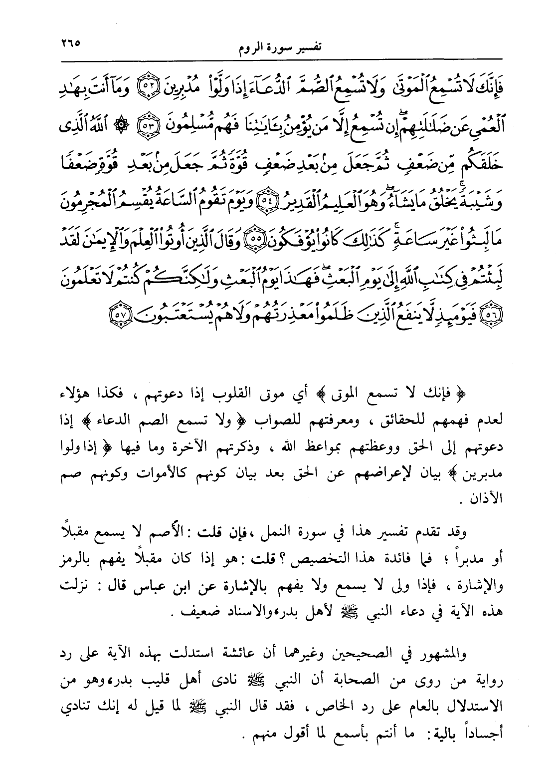 فَإِنَّكَ لَا تُسْمِعُ الْمَوْتَى وَلَا تُسْمِعُ الصُّمَّ الدُّعَاءَ إِذَا وَلَّوْا مُدْبِرِينَ (52) وَمَا أَنْتَ بِهَادِ الْعُمْيِ عَنْ ضَلَالَتِهِمْ إِنْ تُسْمِعُ إِلَّا مَنْ يُؤْمِنُ بِآيَاتِنَا فَهُمْ مُسْلِمُونَ (53) اللَّهُ الَّذِي خَلَقَكُمْ مِنْ ضَعْفٍ ثُمَّ جَعَلَ مِنْ بَعْدِ ضَعْفٍ قُوَّةً ثُمَّ جَعَلَ مِنْ بَعْدِ قُوَّةٍ ضَعْفًا وَشَيْبَةً يَخْلُقُ مَا يَشَاءُ وَهُوَ الْعَلِيمُ الْقَدِيرُ (54) وَيَوْمَ تَقُومُ السَّاعَةُ يُقْسِمُ الْمُجْرِمُونَ مَا لَبِثُوا غَيْرَ سَاعَةٍ كَذَلِكَ كَانُوا يُؤْفَكُونَ (55) وَقَالَ الَّذِينَ أُوتُوا الْعِلْمَ وَالْإِيمَانَ لَقَدْ لَبِثْتُمْ فِي كِتَابِ اللَّهِ إِلَى يَوْمِ الْبَعْثِ فَهَذَا يَوْمُ الْبَعْثِ وَلَكِنَّكُمْ كُنْتُمْ لَا تَعْلَمُونَ (56) فَيَوْمَئِذٍ لَا يَنْفَعُ الَّذِينَ ظَلَمُوا مَعْذِرَتُهُمْ وَلَا هُمْ يُسْتَعْتَبُونَ (57)