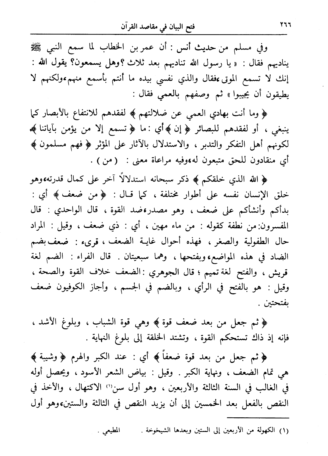 (ثم جعل من بعد قوة ضعفاً) أي: عند الكبر والهرم (وشيبة) هي تمام الضعف، ونهاية الكبر. وقيل: بياض الشعر الأسود، ويحصل أوله في الغالب في السنة الثالثة والأربعين، وهو أول سن (¬1) الاكتهال، والأخذ في النقص بالفعل بعد الخمسين إلى أن يزيد النقص في الثالثة والستين، وهو أول