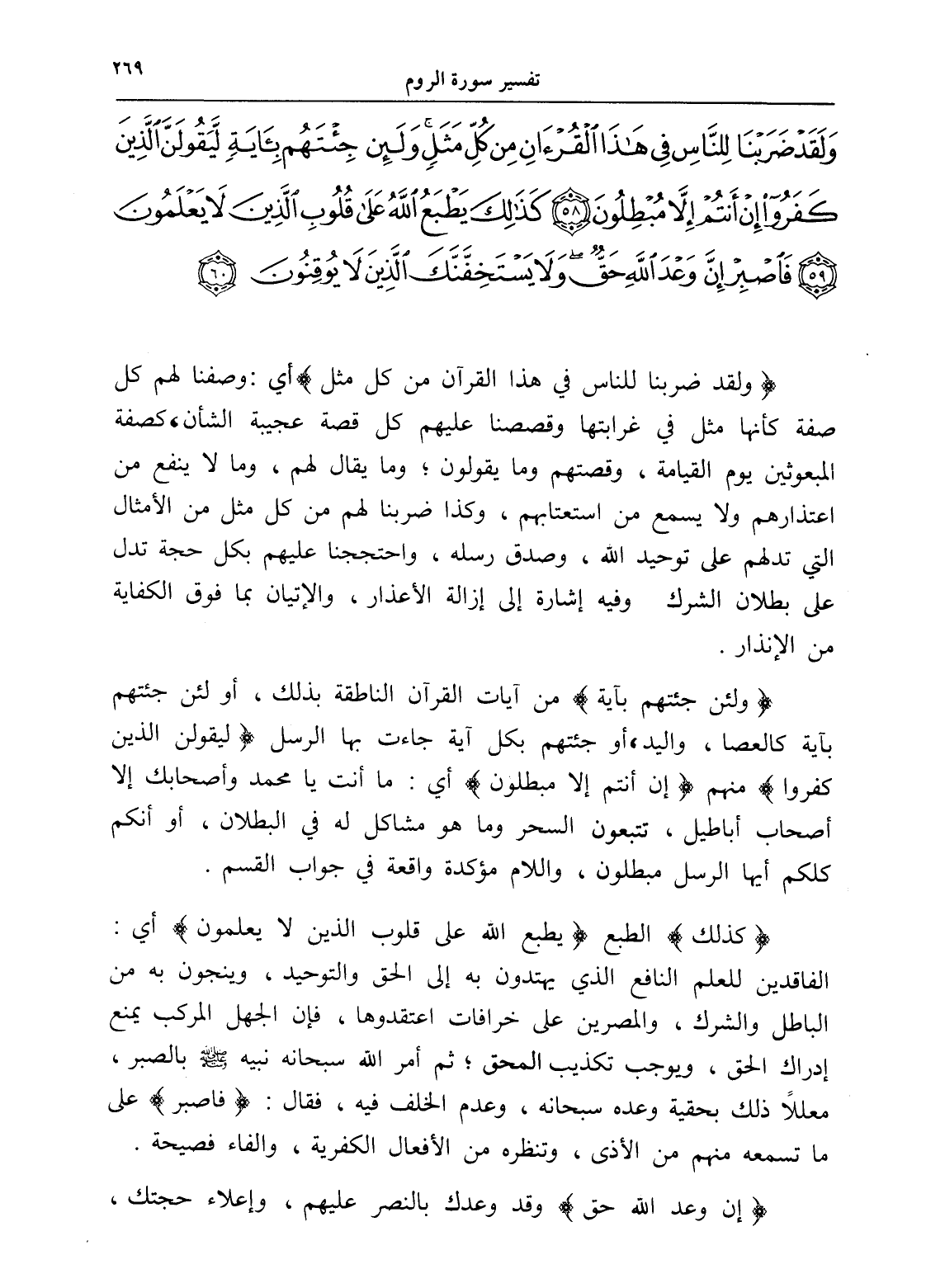 وَلَقَدْ ضَرَبْنَا لِلنَّاسِ فِي هَذَا الْقُرْآنِ مِنْ كُلِّ مَثَلٍ وَلَئِنْ جِئْتَهُمْ بِآيَةٍ لَيَقُولَنَّ الَّذِينَ كَفَرُوا إِنْ أَنْتُمْ إِلَّا مُبْطِلُونَ (58) كَذَلِكَ يَطْبَعُ اللَّهُ عَلَى قُلُوبِ الَّذِينَ لَا يَعْلَمُونَ (59) فَاصْبِرْ إِنَّ وَعْدَ اللَّهِ حَقٌّ وَلَا يَسْتَخِفَّنَّكَ الَّذِينَ لَا يُوقِنُونَ (60)